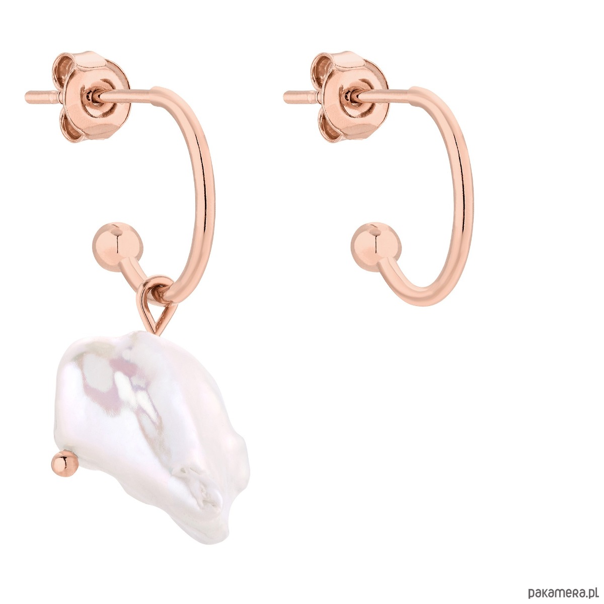 Złote asymetryczne kolczyki z naturalną perłą. Całość wykonana ze srebra 925 powlekanego 18 karatowym różowym złotem. Perła jest płaska, nieregularna, unikatowa i może różnić się od tej na zdjęciu.