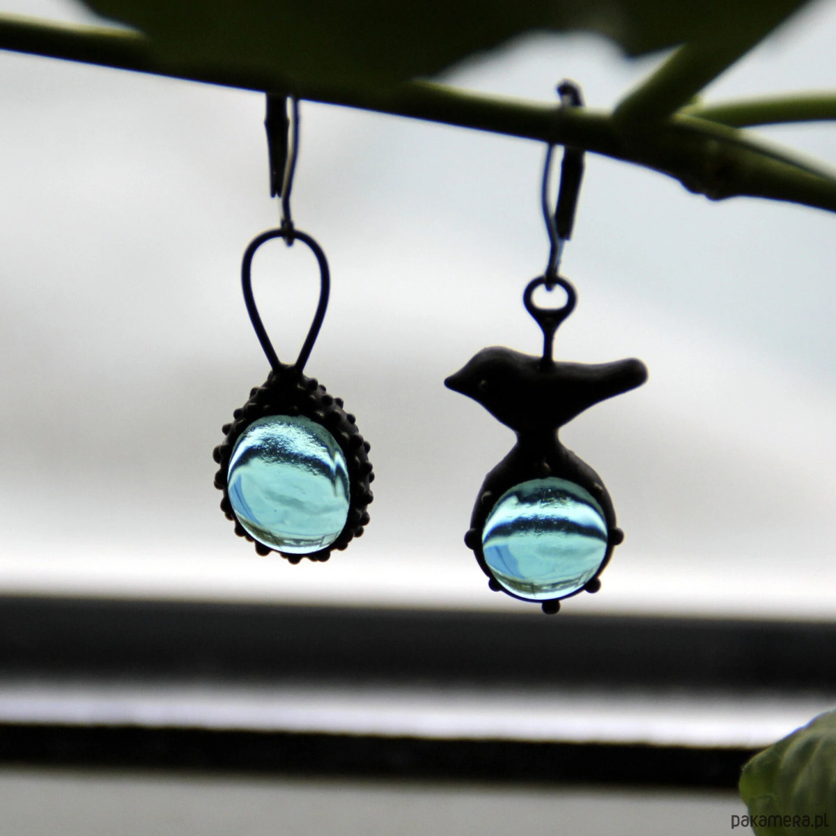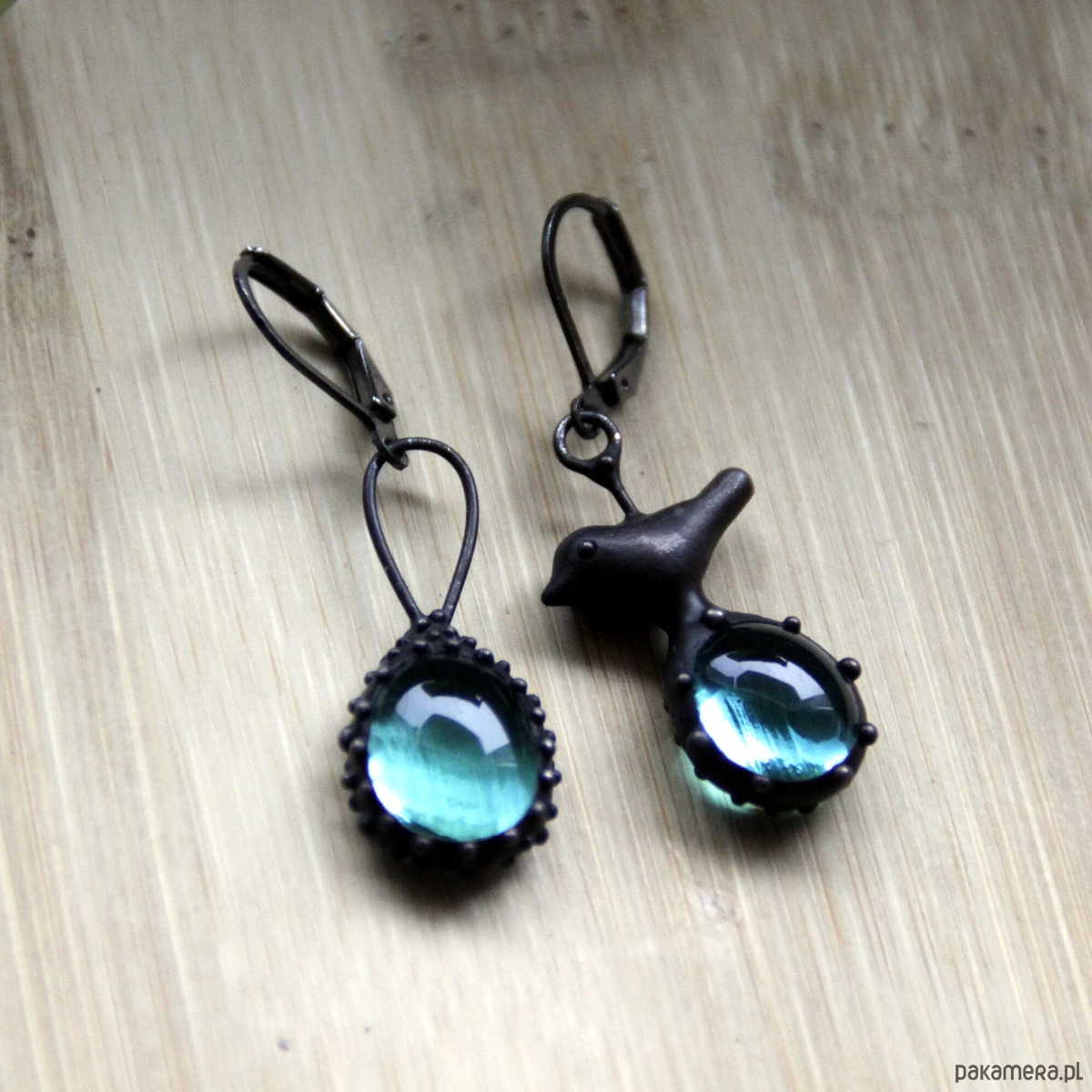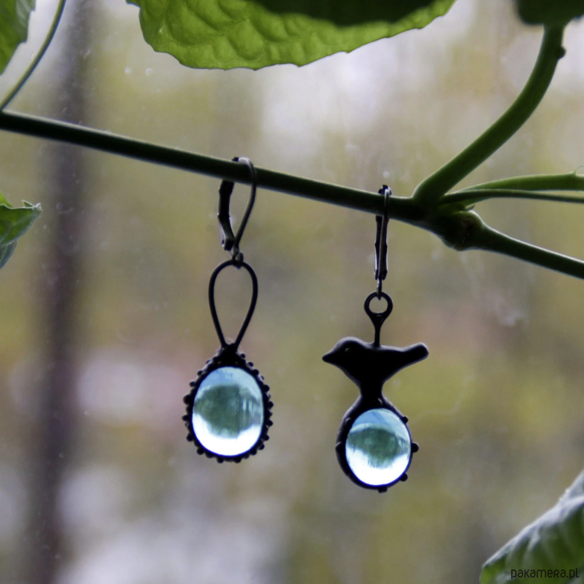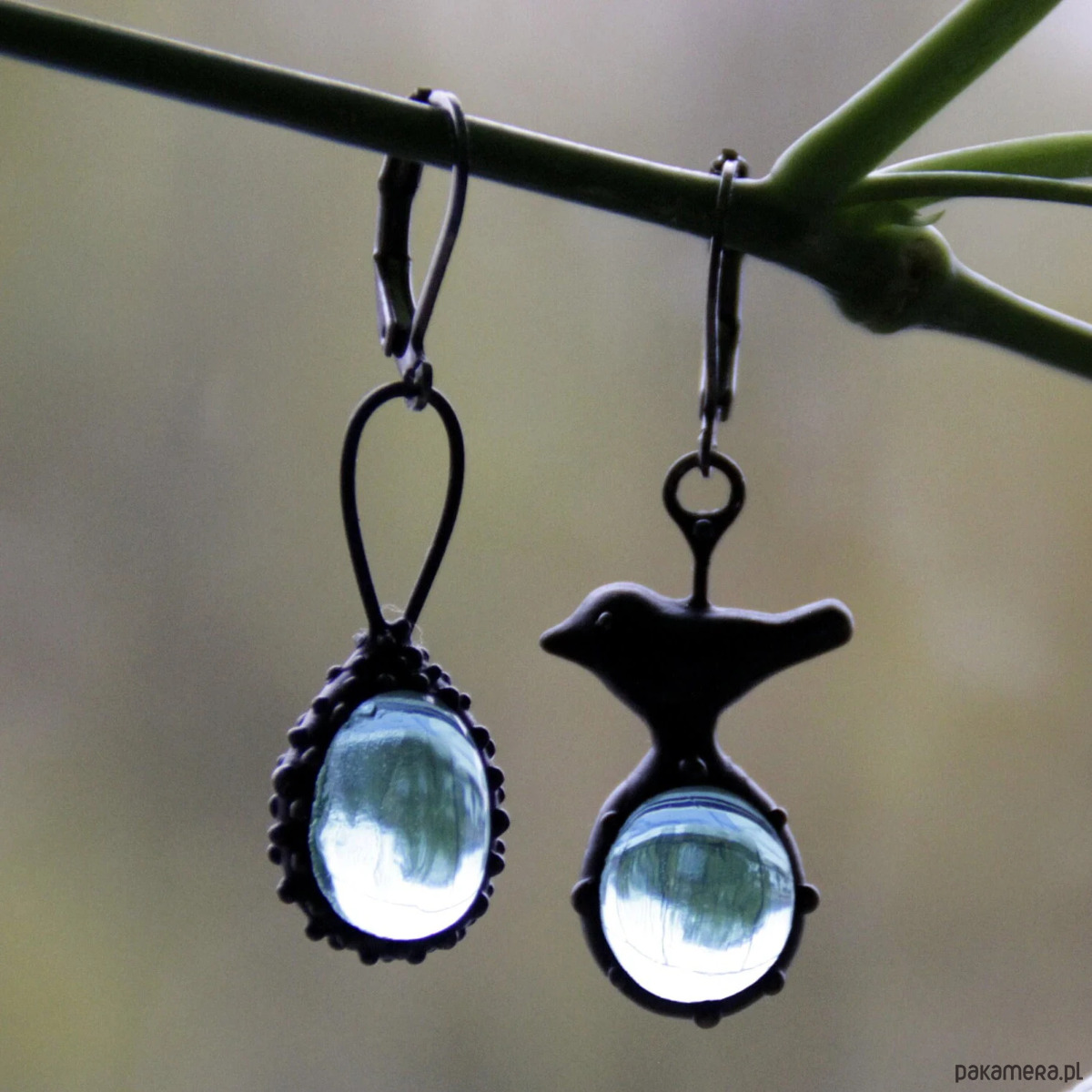 Asymetryczne kolczyki ze szkła z ptakiem inspirowane dziką naturą lasu