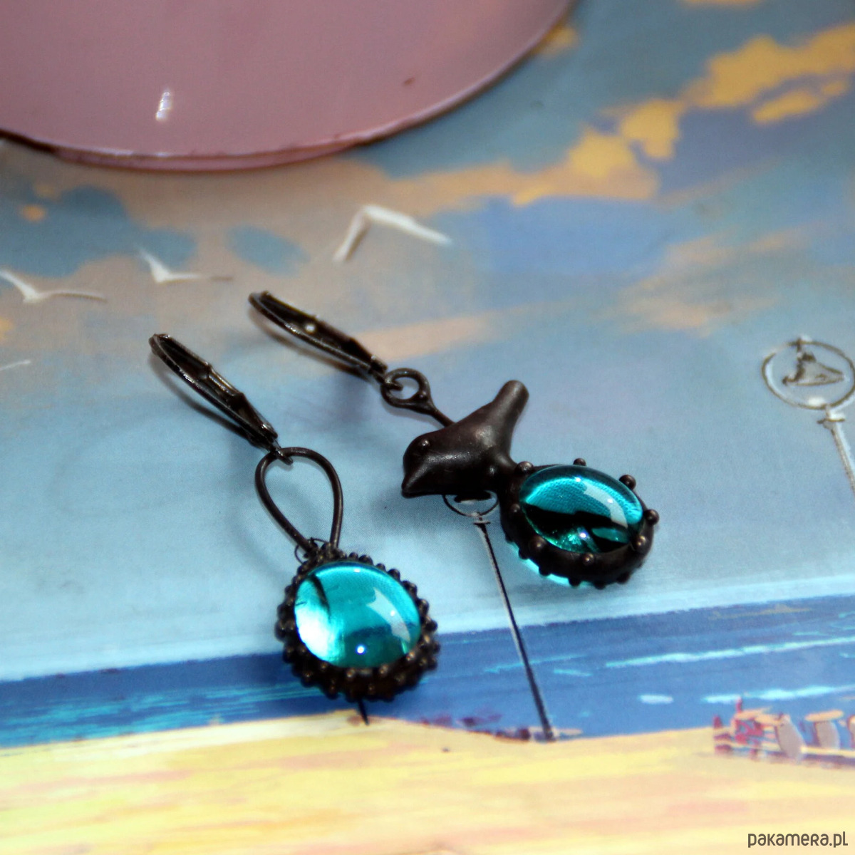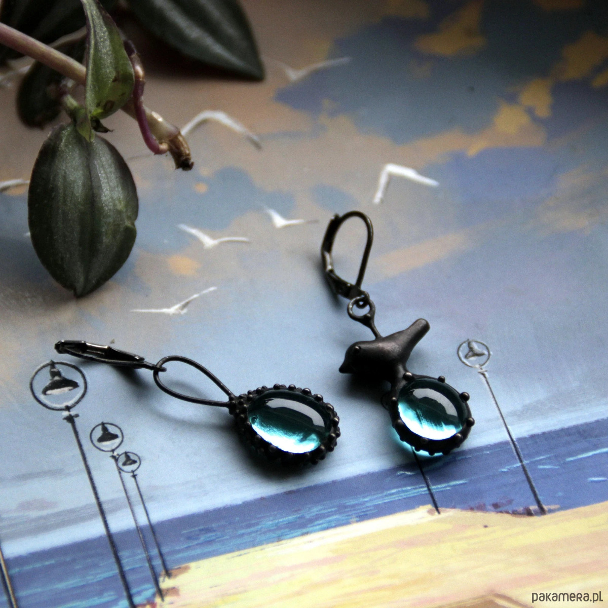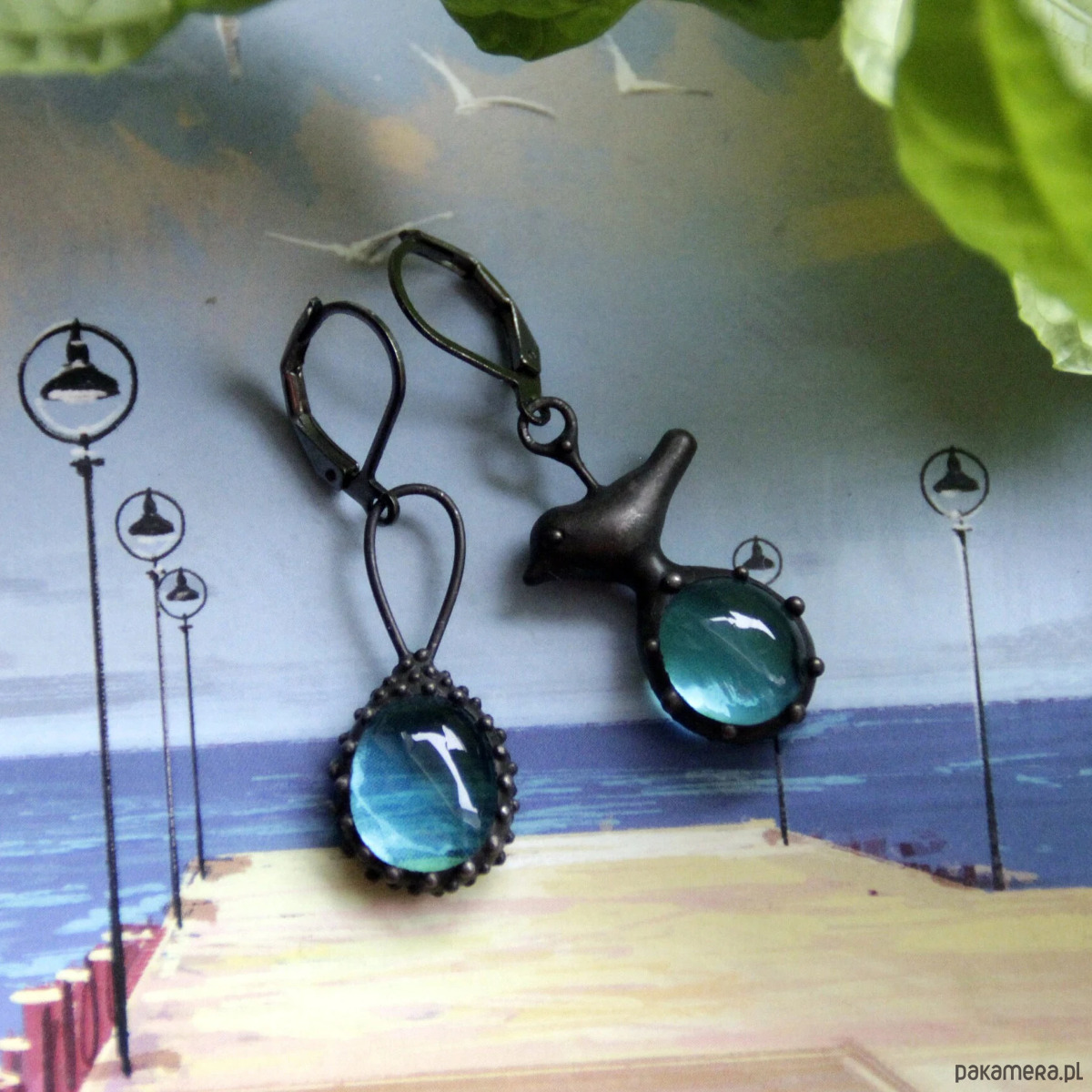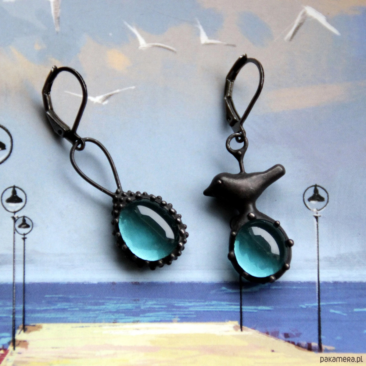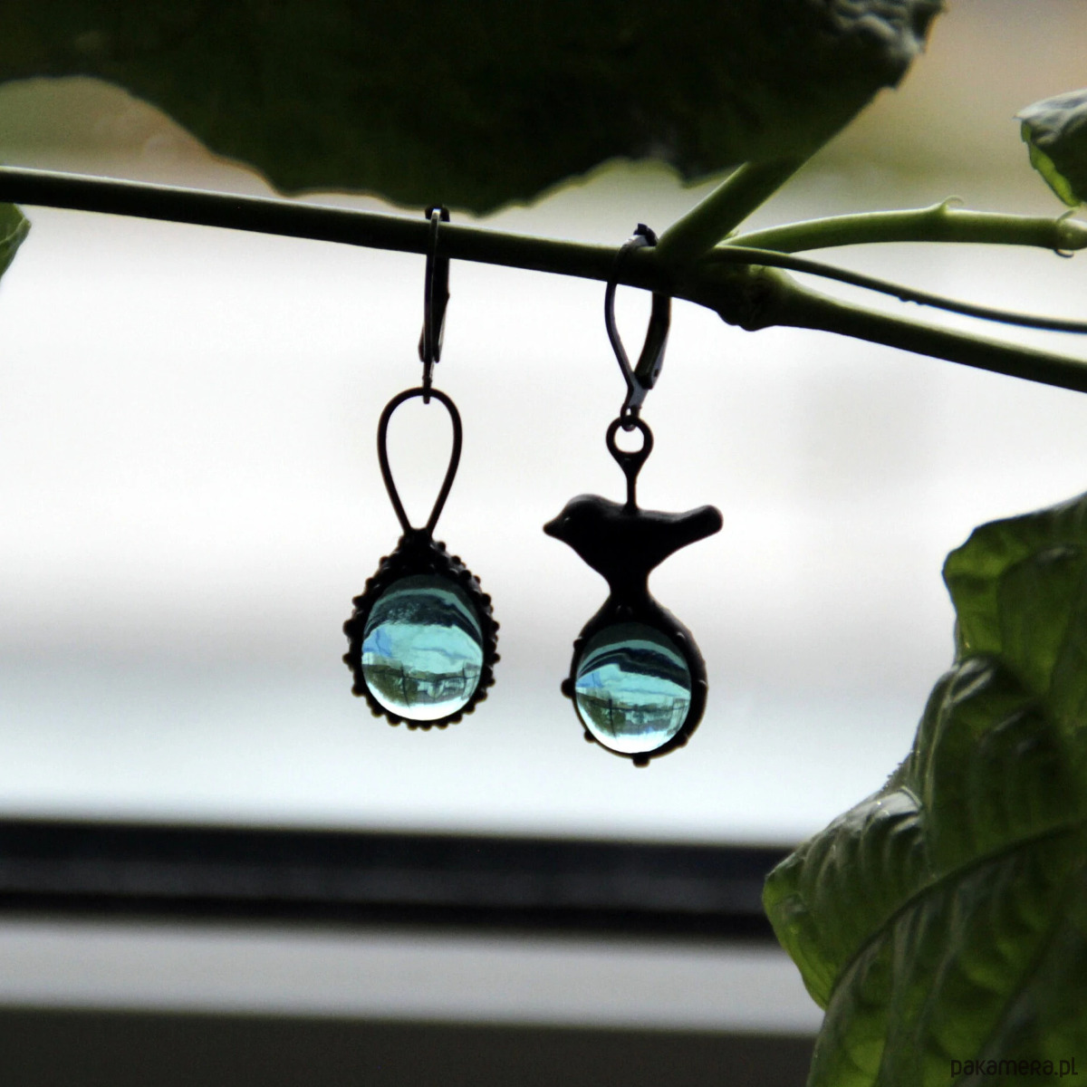 Asymetryczne kolczyki ze szkła z ptakiem inspirowane dziką naturą lasu