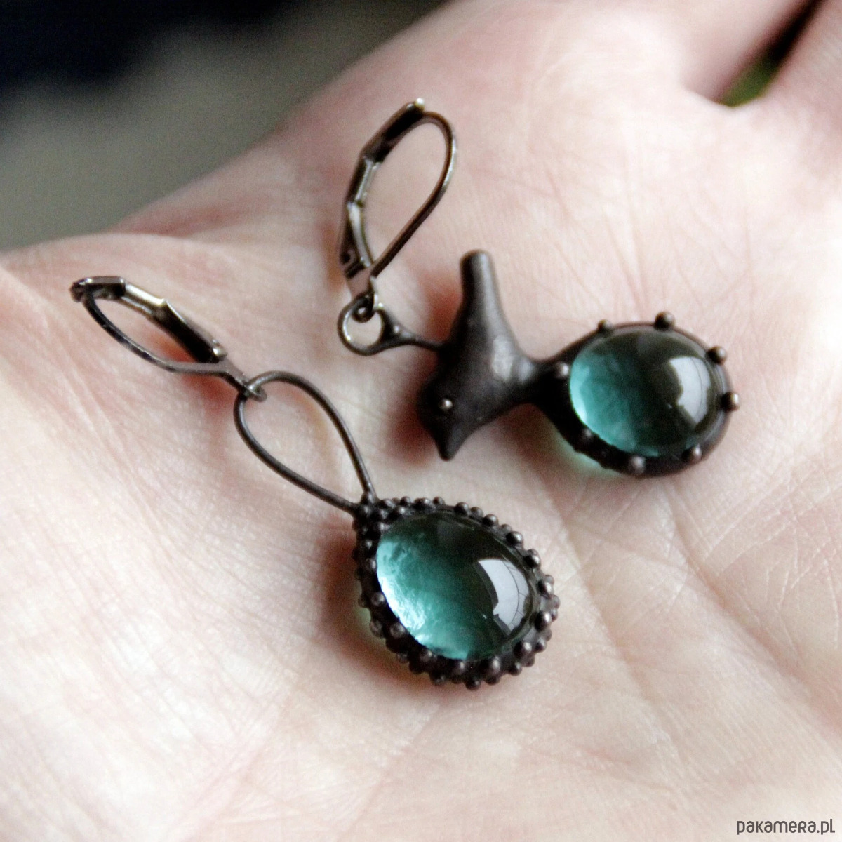 Asymetryczne kolczyki w stylu secesyjnym boho, wykonane ręcznie z miedzi, stali, cyny, szkła. Pokryte patyną, pokryte środkiem przeciwutleniającym, szlifowane, polerowane. Niezwykła i mocna, estetyczna biżuteria leśna. Wszystkie elementy są wykonane ręcznie, co zapewnia indywidualność każdego produktu wykonanego w warsztacie Yadovito. Stop cyny i miedzi jest polerowany roztworem wykończeniowym, aby nadać biżuterii szlachetny wygląd, a jednocześnie zapobiec utlenianiu się metalu. W kolczykach wykorzystano szkło topione w specjalnym piecu. Po stopieniu szkło nabiera niemal niepowtarzalnego kształtu i niesamowitych odcieni kolorów, które mienią się w świetle. Kolor: czarny/niebieski. Rozmiar około 2,5/1,5 cm.