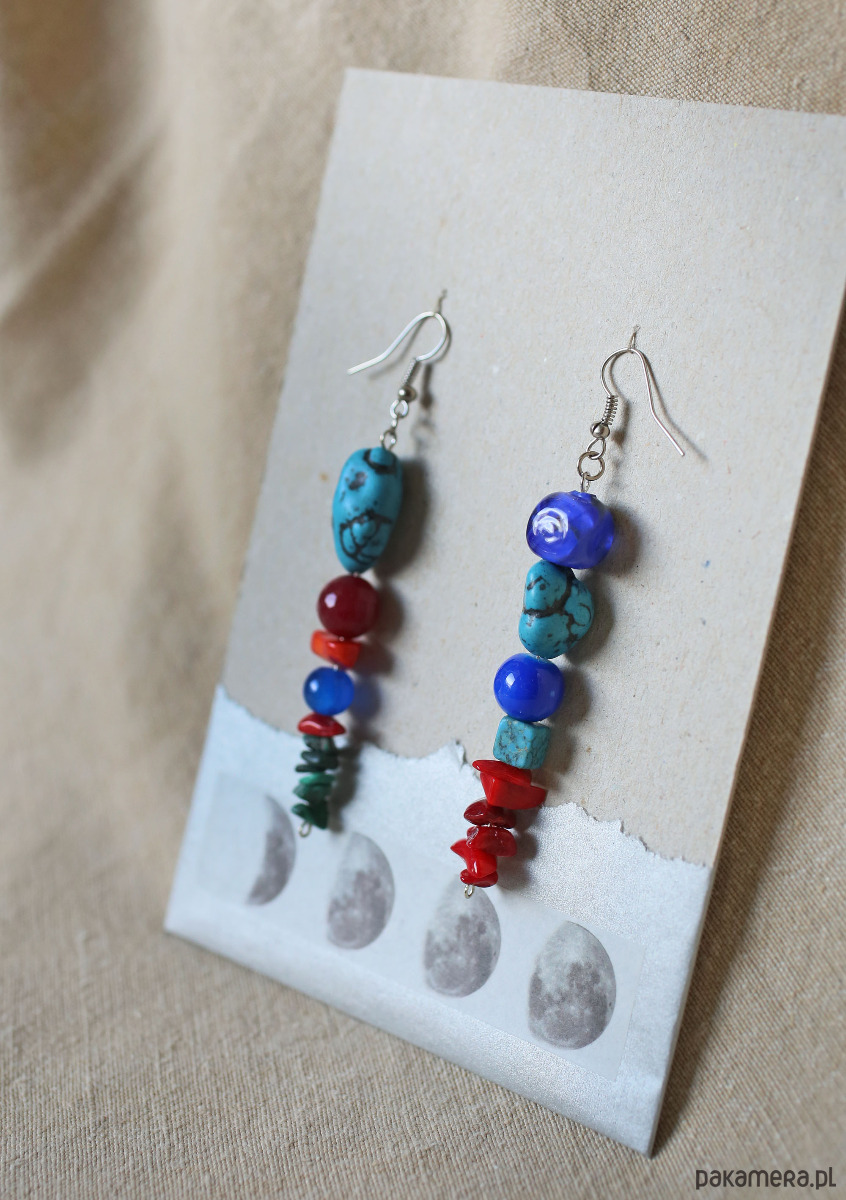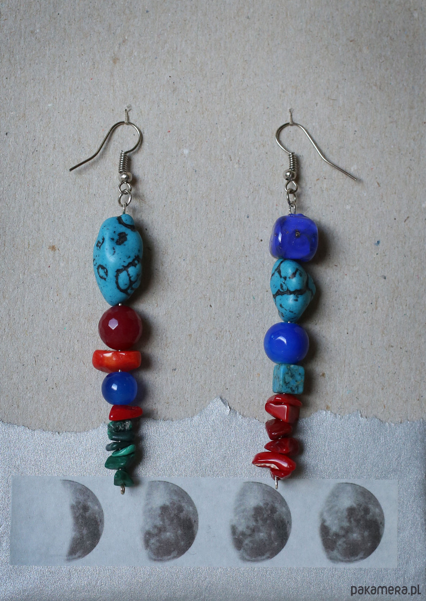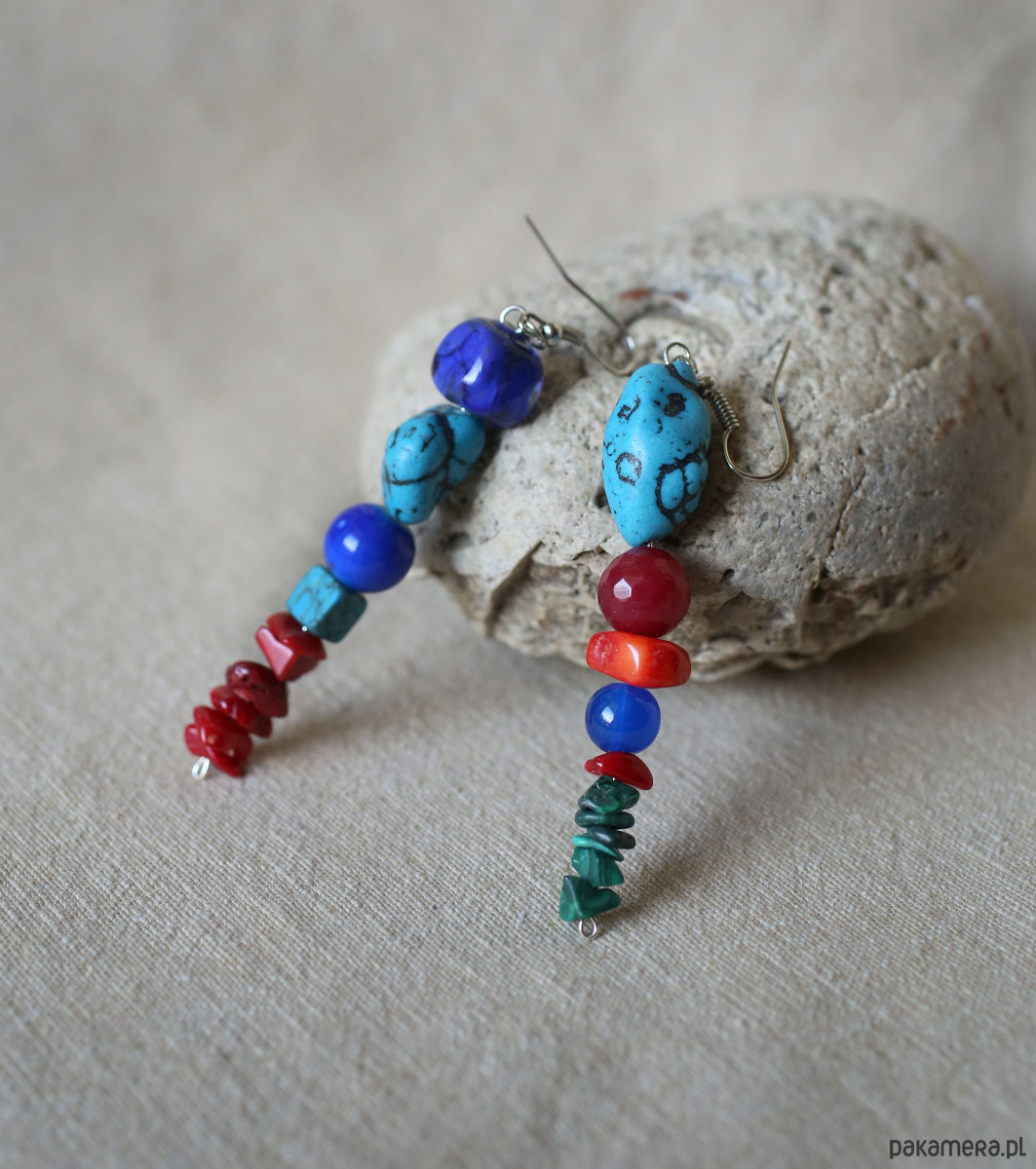 Asymetryczne kolczyki wiszące, w stylu boho, wykonane z różnobarwnych korali - kamieni szlachetnych i półszlachetnych. Bigle ze stali w kolorze ciemnego srebra.