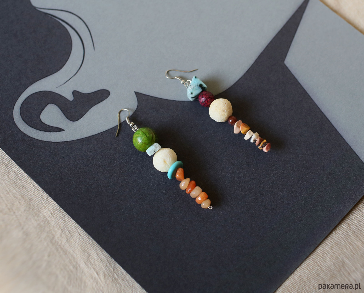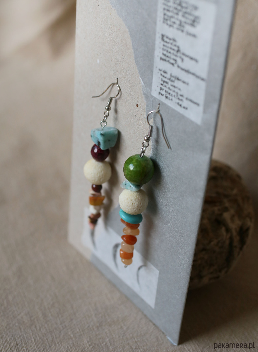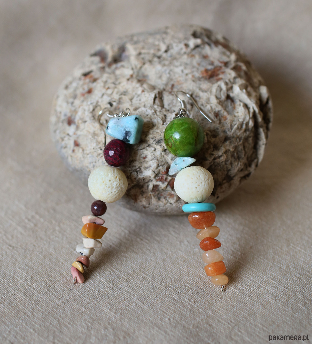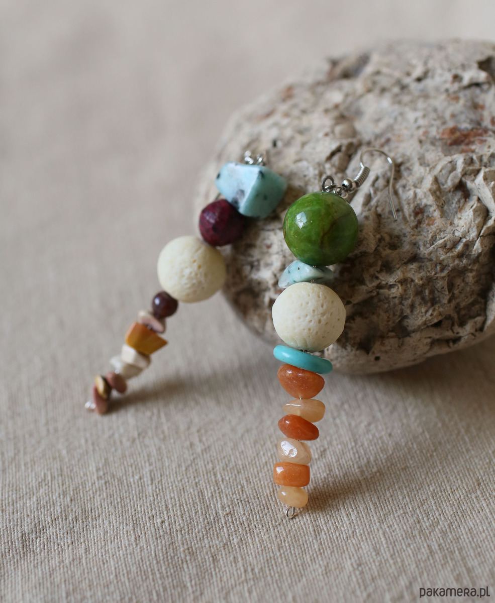 Asymetryczne kolczyki wiszące, w stylu boho, wykonane z różnobarwnych korali - kamieni szlachetnych i półszlachetnych. Bigle ze stali w kolorze ciemnego srebra.