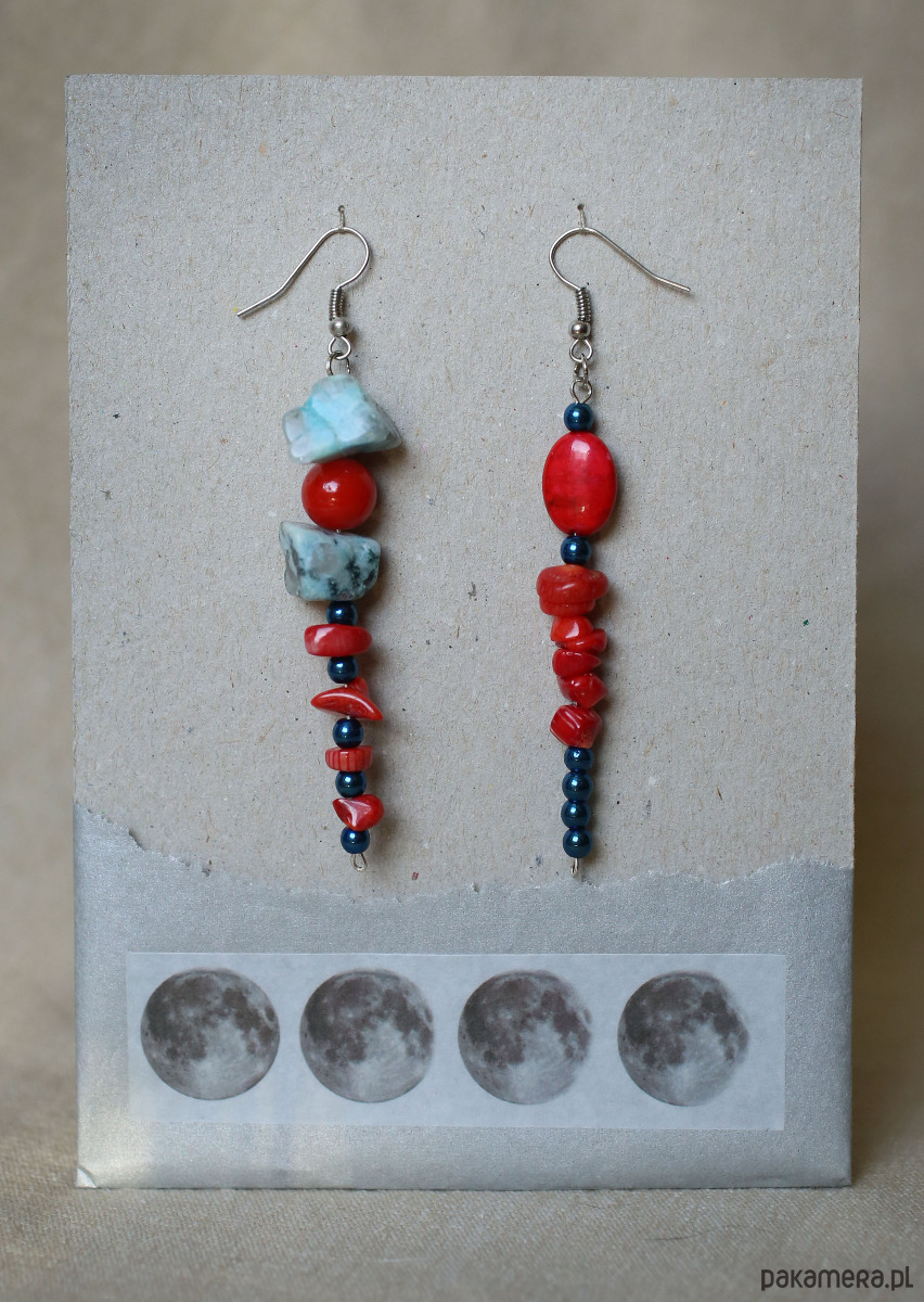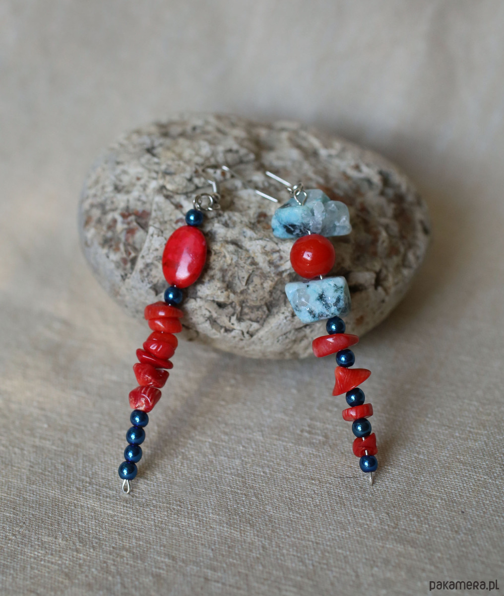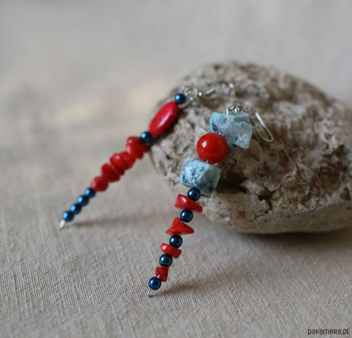 Asymetryczne kolczyki wiszące, w stylu boho, wykonane z różnobarwnych korali - kamieni szlachetnych i półszlachetnych. Bigle ze stali w kolorze ciemnego srebra.