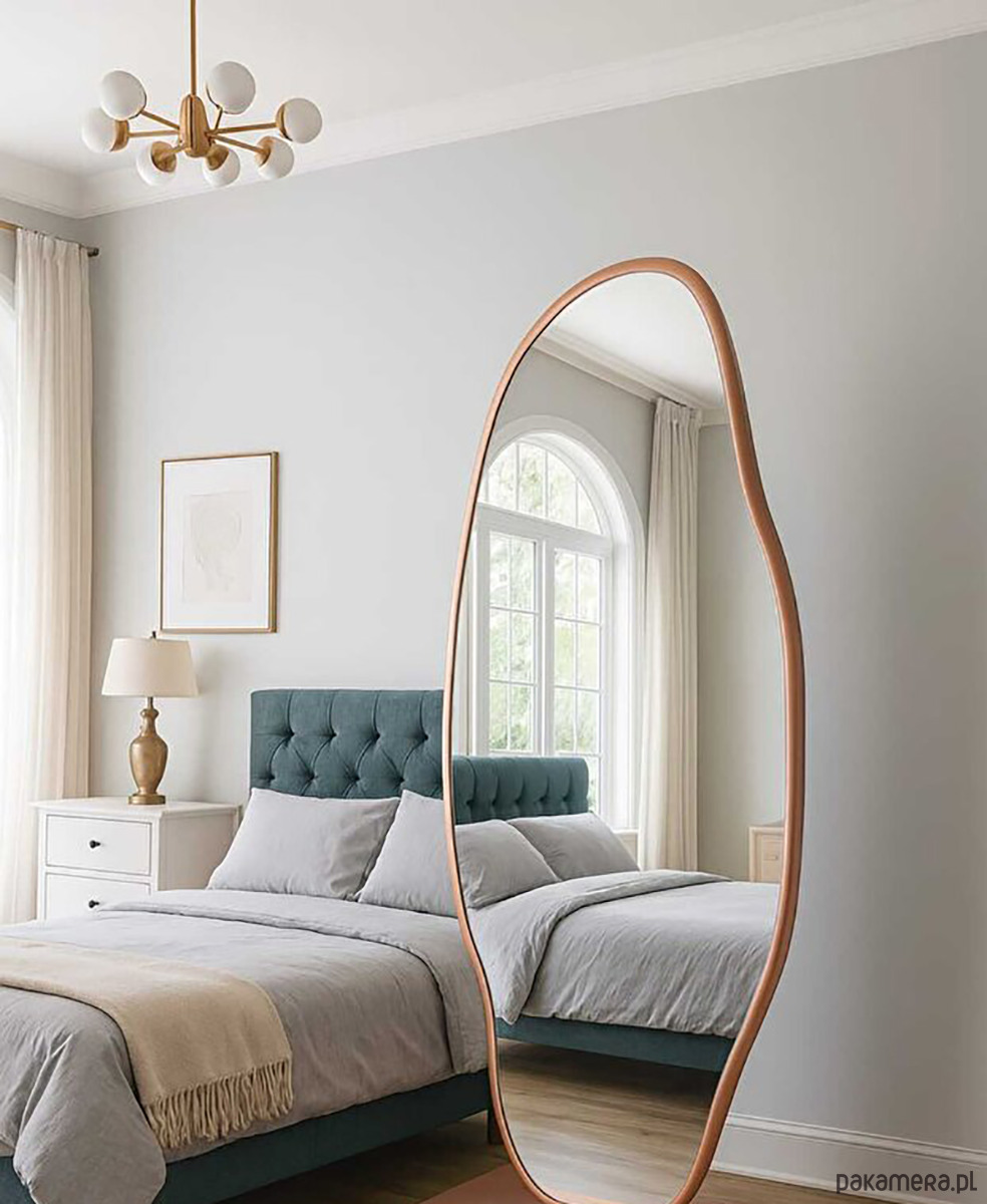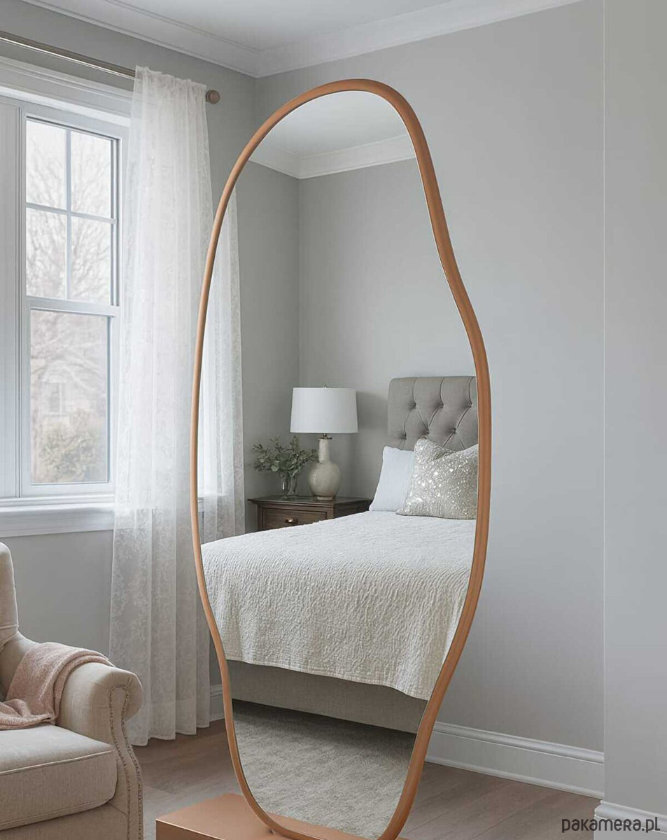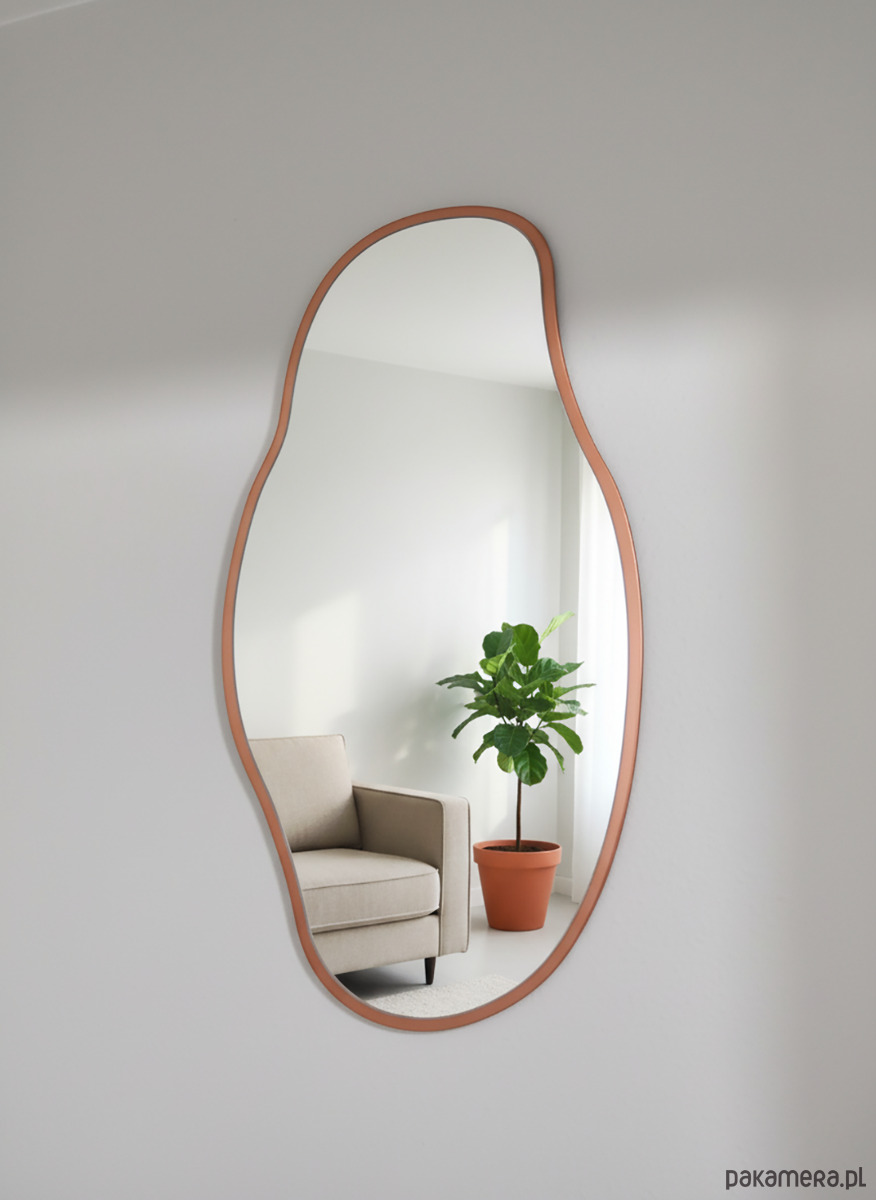Asymetryczne lustro ścienne 40x75 cm to wyjątkowy dodatek do wnętrz w stylu nowoczesnym i minimalistycznym. Jego organiczny kształt nadaje przestrzeni lekkości i elegancji, a rama MDF w kolorze miedzi (efekt brązu) dodaje ciepłego, designerskiego charakteru.