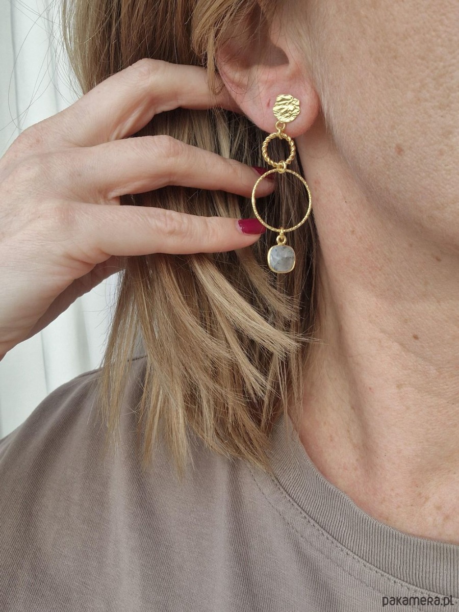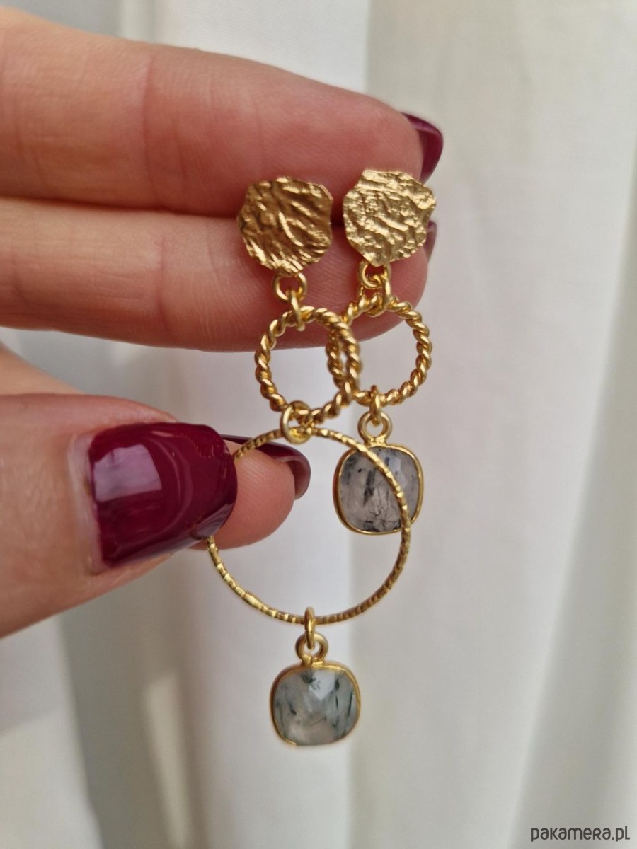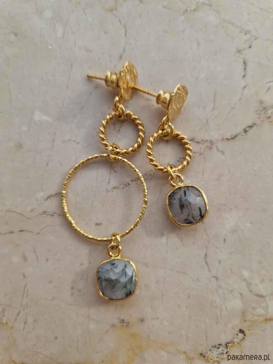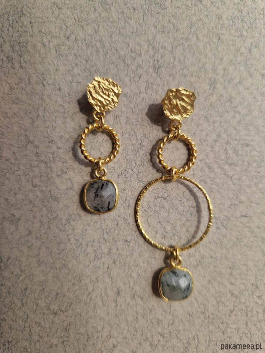 Asymetryczne, delikatne kolczyki wykonane z kółek o różnej wielkości i strukturze: skręconych, diamentowanych i szczotkowanych, zakończonych zawieszkami z naturalnych kwarców górskich z rutylem. Kolczyki tworzą niepowtarzalną parę, która uświetni, każdą wiosenną stylizację.