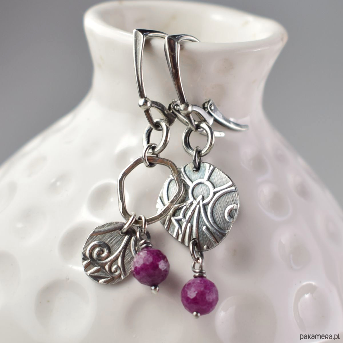 Asymetrycznie - srebrne kolczyki z rubinem