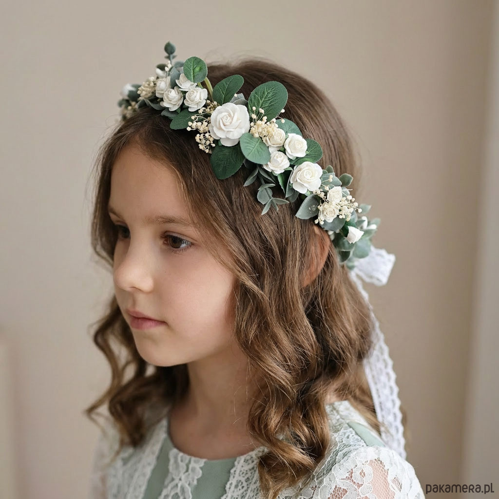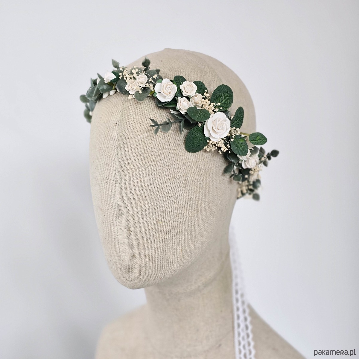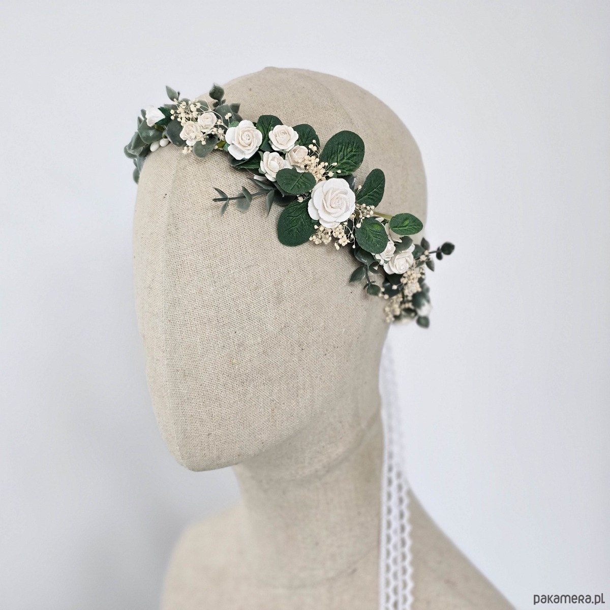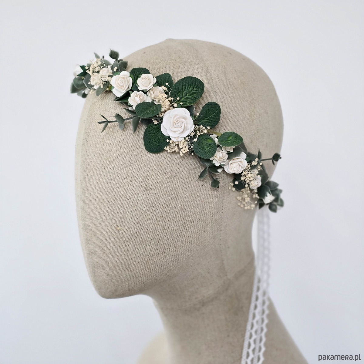 Uroczy, asymetryczny wianek na głowę, zdobiony syntetycznymi kwiatami i listkami. Możliwość regulacji wielkości obwodu, dzięki koronkowej tasiemce z tyłu. Będzie pasował zarówno na głowę dziecka, jak i osoby dorosłej. Ozdoba będzie idealna na Pierwszą Komunię Świętą. Wianek wykonany ręcznie, z najwyższą starannością, w pracowni "Lola White" w Polsce.
