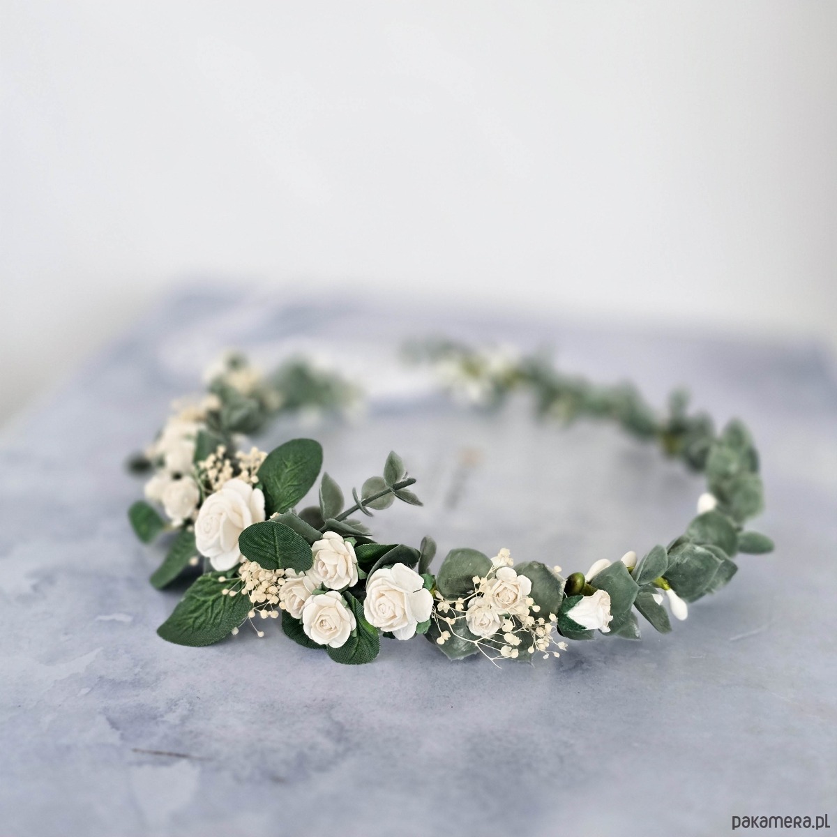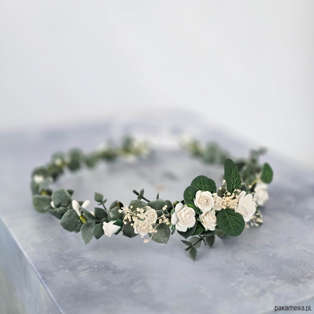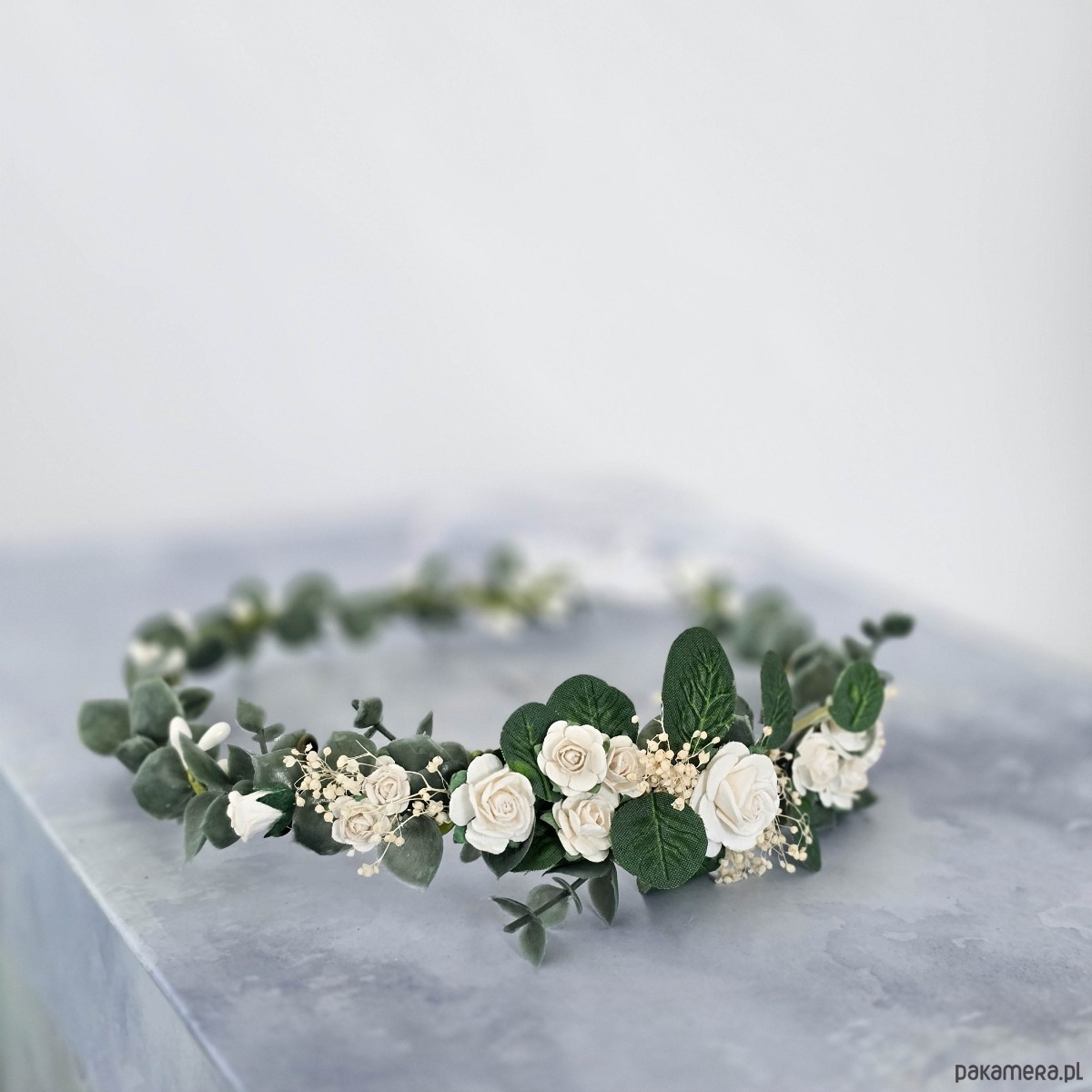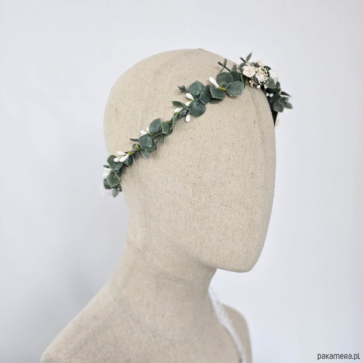 Uroczy, asymetryczny wianek na głowę, zdobiony syntetycznymi kwiatami i listkami. Możliwość regulacji wielkości obwodu, dzięki koronkowej tasiemce z tyłu. Będzie pasował zarówno na głowę dziecka, jak i osoby dorosłej. Ozdoba będzie idealna na Pierwszą Komunię Świętą. Wianek wykonany ręcznie, z najwyższą starannością, w pracowni "Lola White" w Polsce.