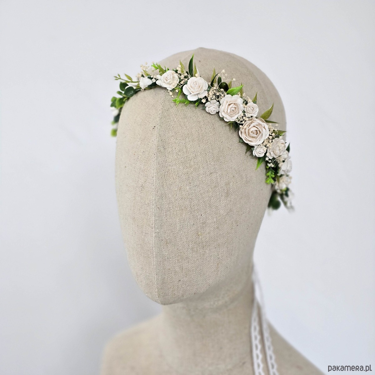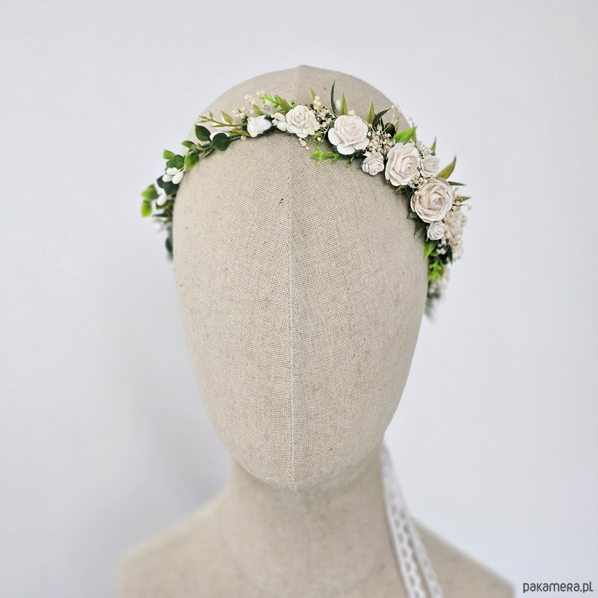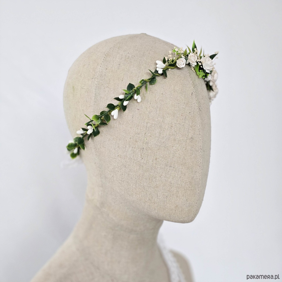 Uroczy, asymetryczny wianek na głowę, zdobiony syntetycznymi kwiatami i listkami. Możliwość regulacji wielkości obwodu, dzięki koronkowej tasiemce z tyłu. Będzie pasował zarówno na głowę dziecka, jak i osoby dorosłej. Ozdoba będzie idealna na Pierwszą Komunię Świętą. Wianek wykonany ręcznie, z najwyższą starannością, w pracowni "Lola White" w Polsce.