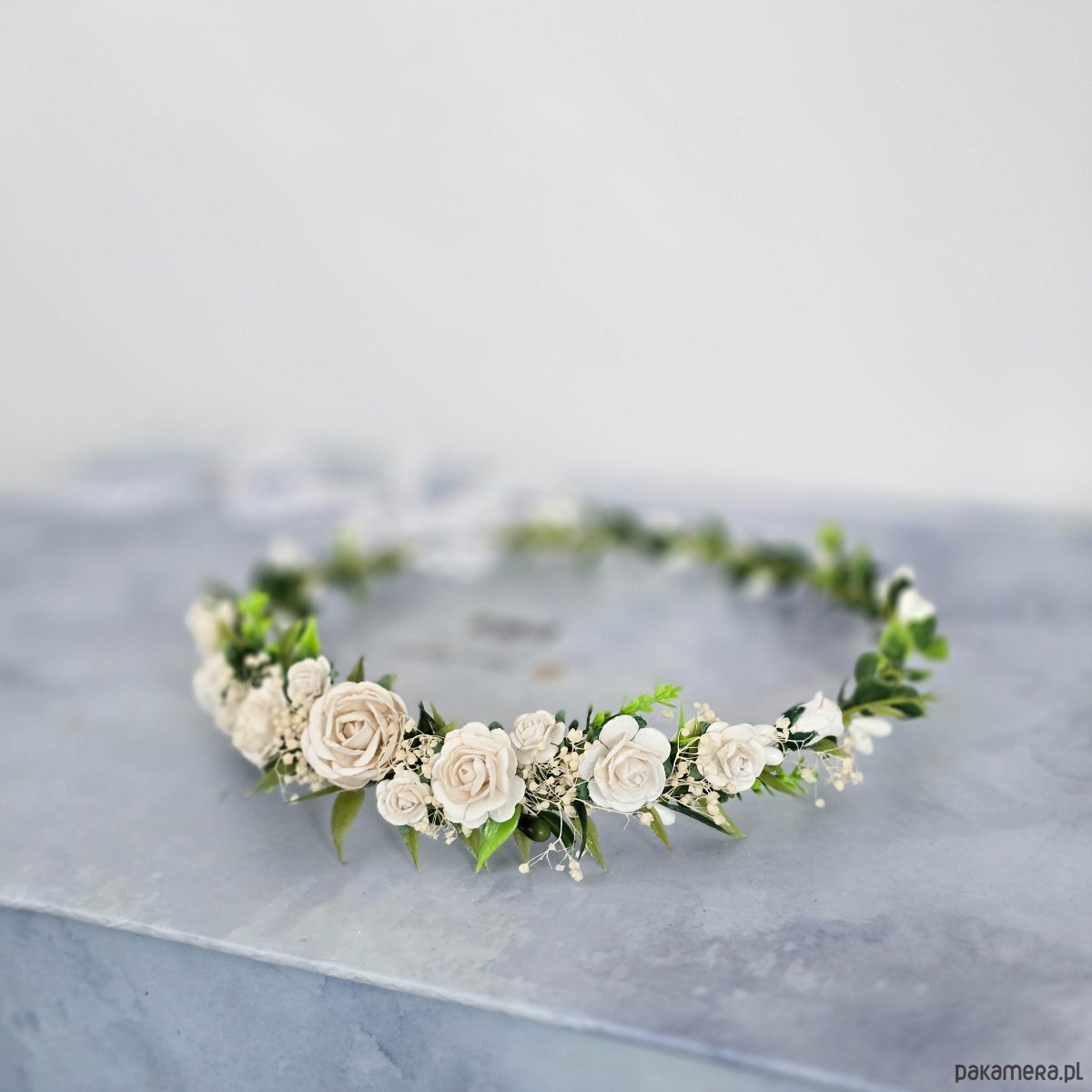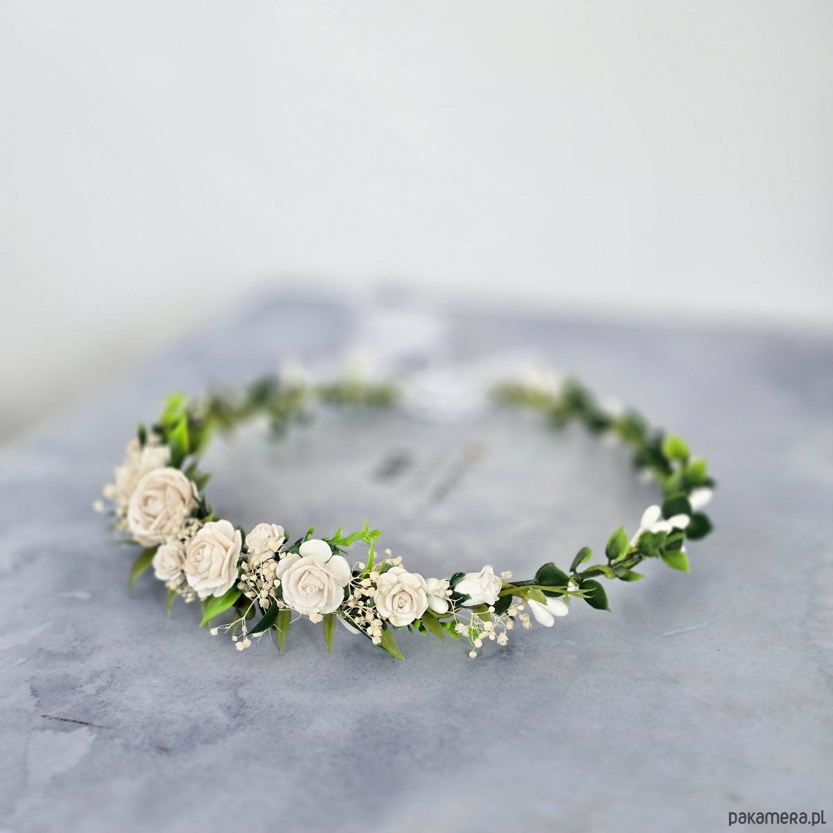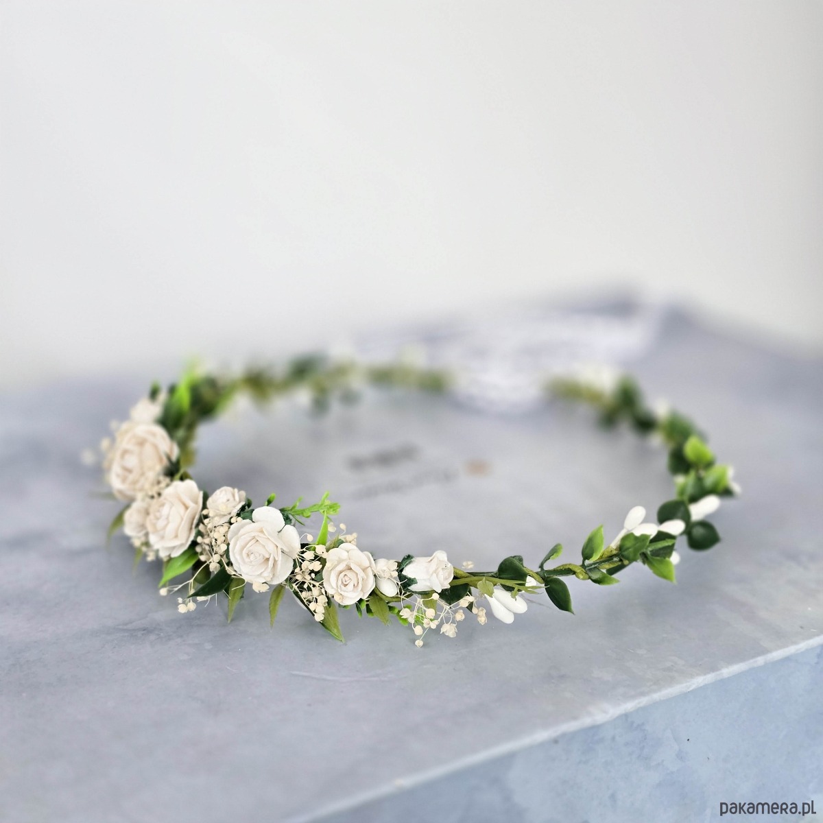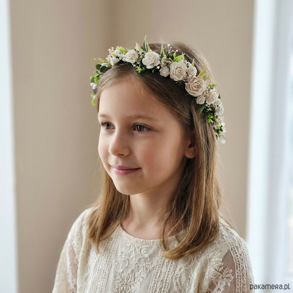 Uroczy, asymetryczny wianek na głowę, zdobiony syntetycznymi kwiatami i listkami. Możliwość regulacji wielkości obwodu, dzięki koronkowej tasiemce z tyłu. Będzie pasował zarówno na głowę dziecka, jak i osoby dorosłej. Ozdoba będzie idealna na Pierwszą Komunię Świętą. Wianek wykonany ręcznie, z najwyższą starannością, w pracowni "Lola White" w Polsce.