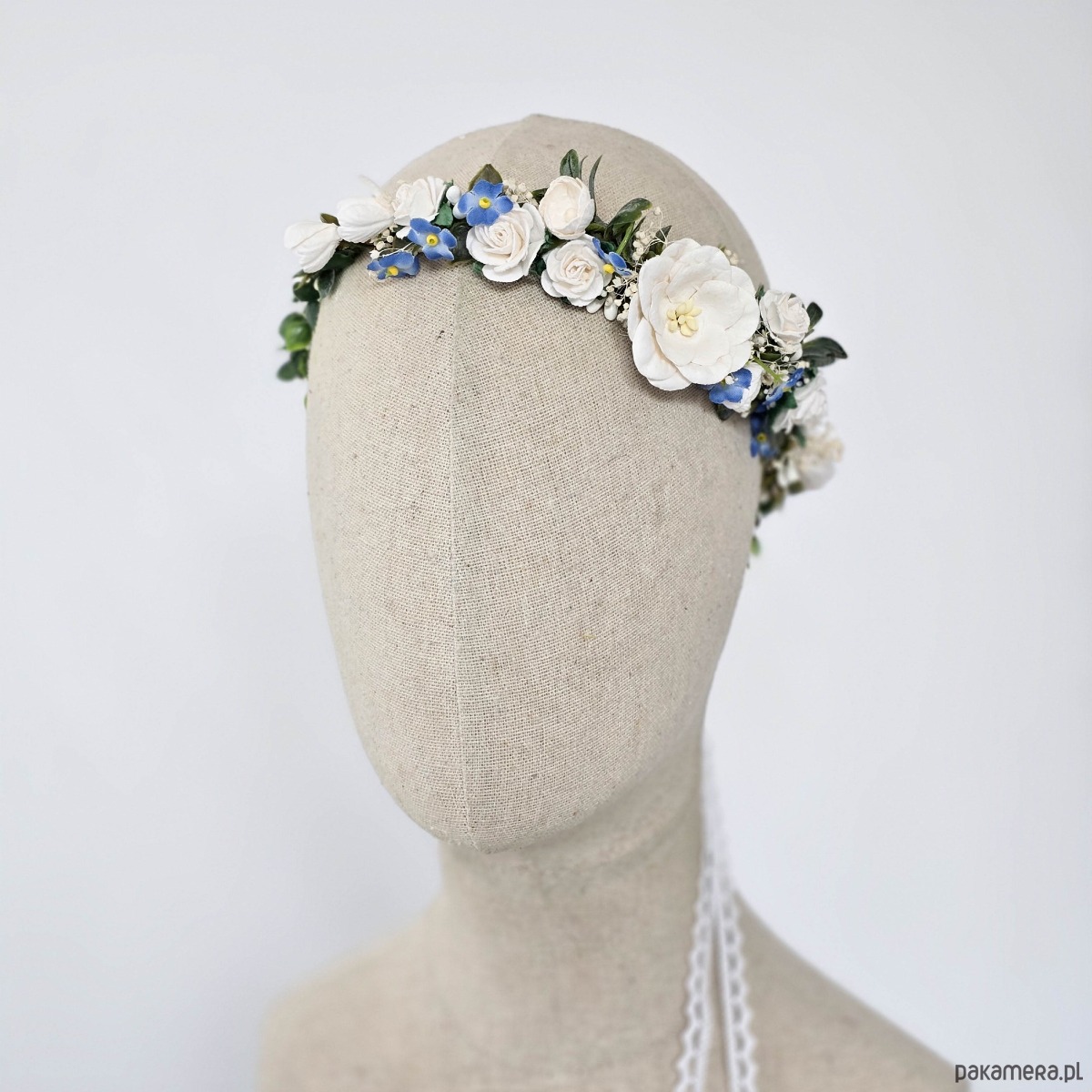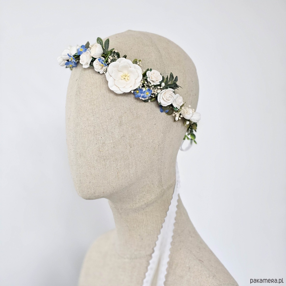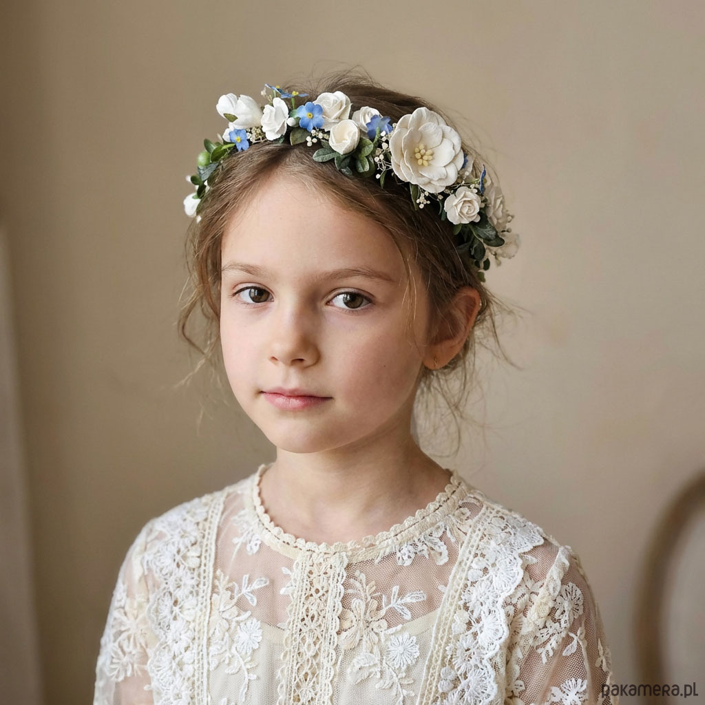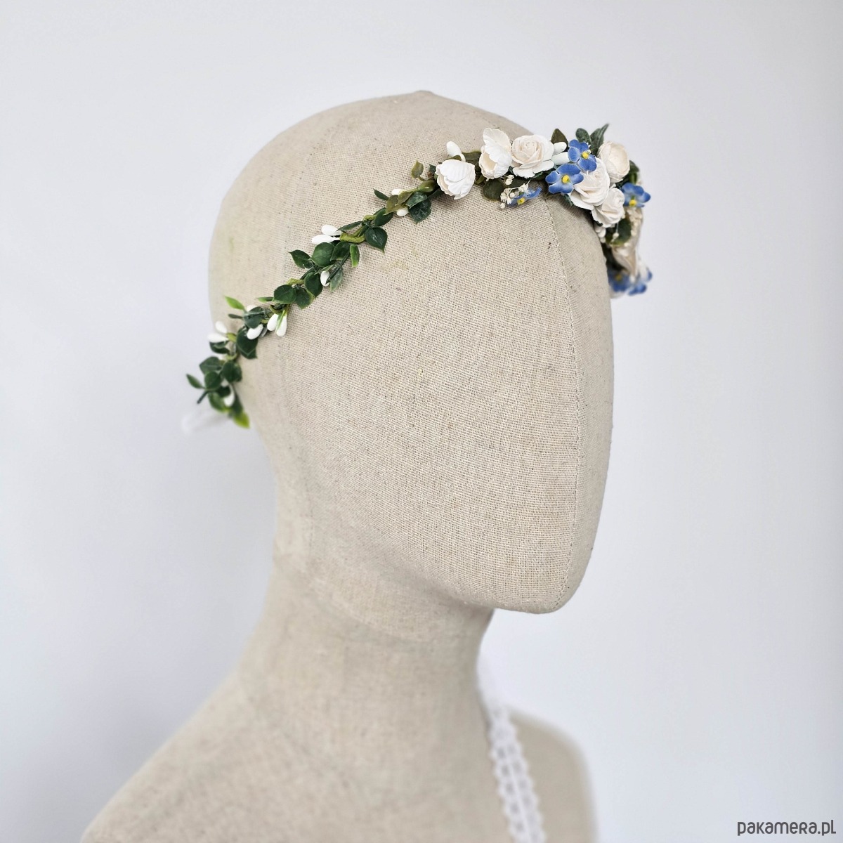 Uroczy, asymetryczny wianek na głowę, zdobiony syntetycznymi kwiatami i listkami. Możliwość regulacji wielkości obwodu, dzięki koronkowej tasiemce z tyłu. Będzie pasował zarówno na głowę dziecka, jak i osoby dorosłej. Ozdoba będzie idealna na Pierwszą Komunię Świętą. Wianek wykonany ręcznie, z najwyższą starannością, w pracowni "Lola White" w Polsce.
