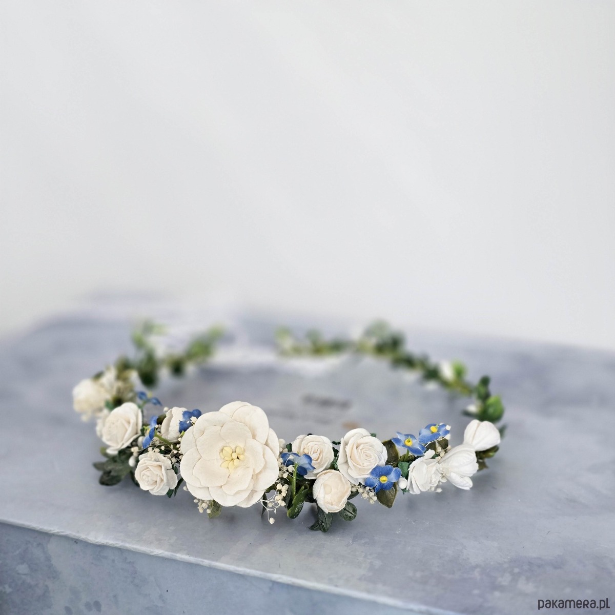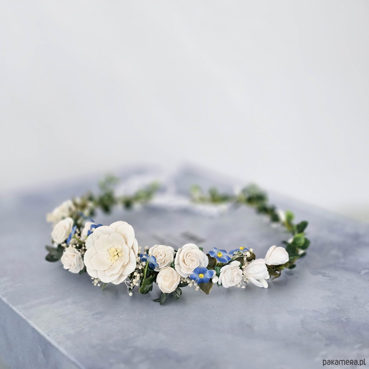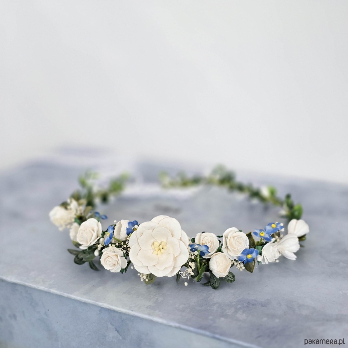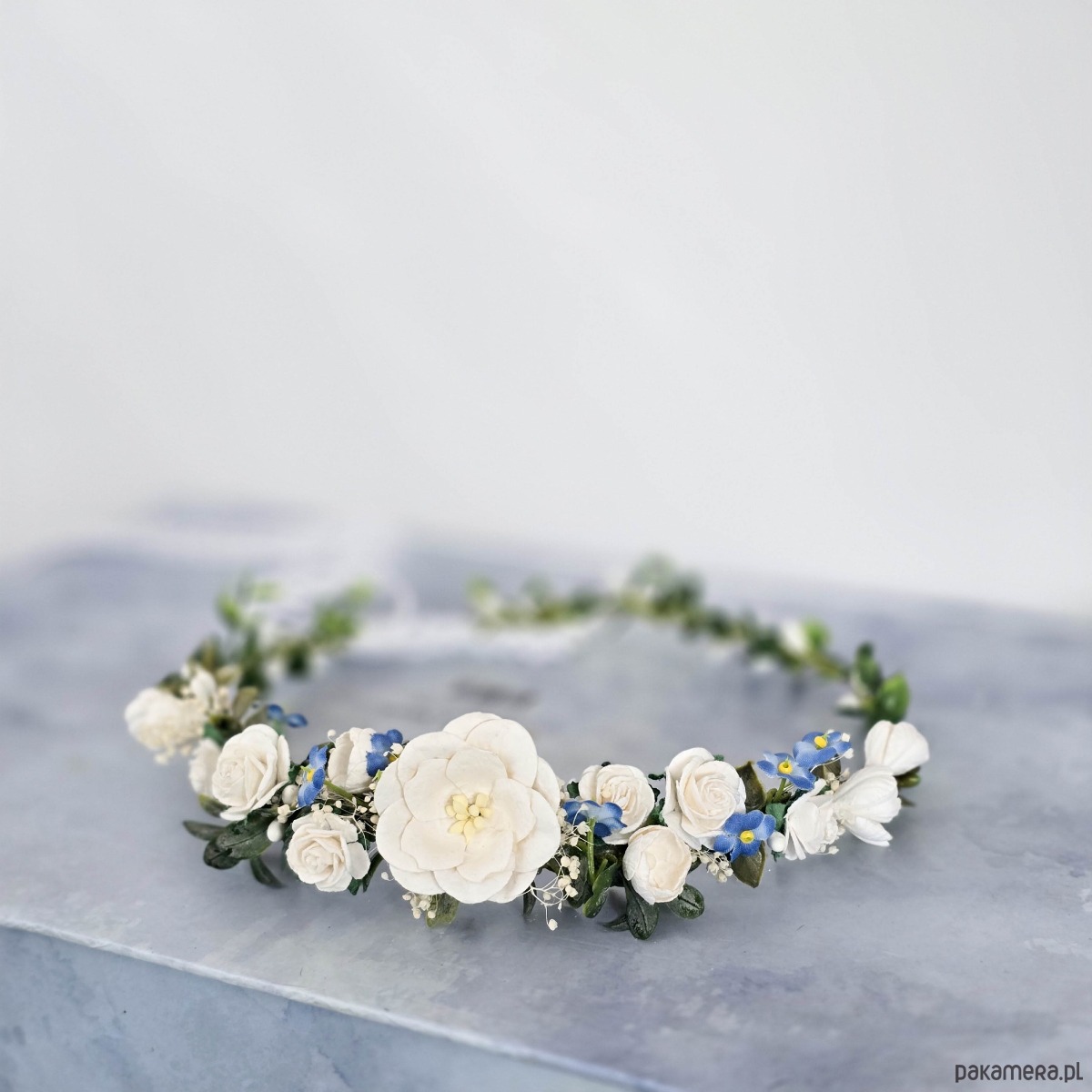 Uroczy, asymetryczny wianek na głowę, zdobiony syntetycznymi kwiatami i listkami. Możliwość regulacji wielkości obwodu, dzięki koronkowej tasiemce z tyłu. Będzie pasował zarówno na głowę dziecka, jak i osoby dorosłej. Ozdoba będzie idealna na Pierwszą Komunię Świętą. Wianek wykonany ręcznie, z najwyższą starannością, w pracowni "Lola White" w Polsce.