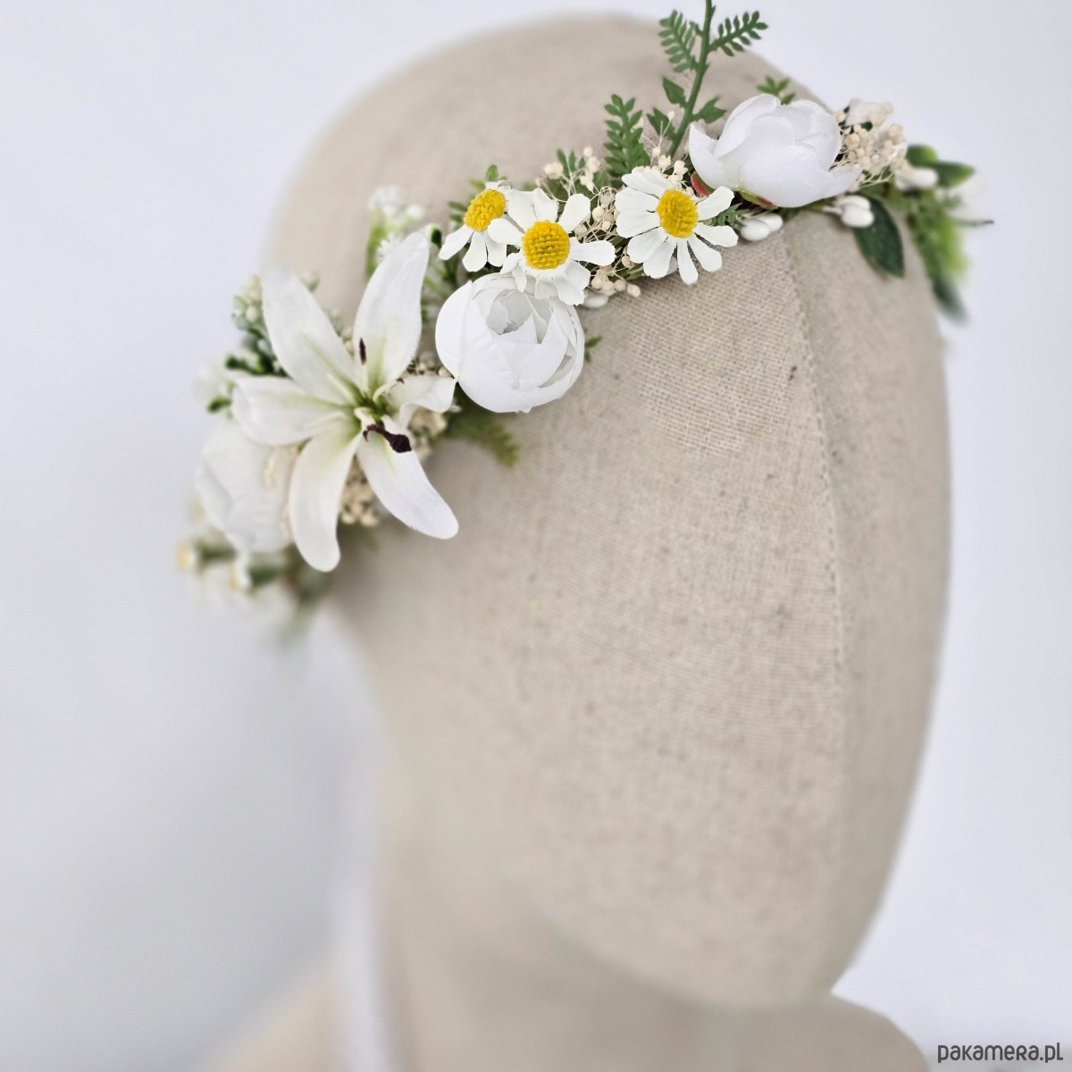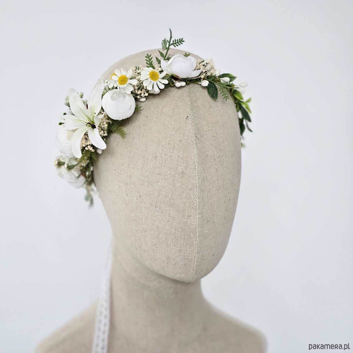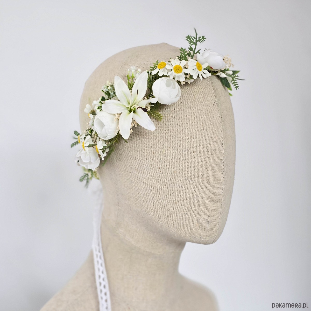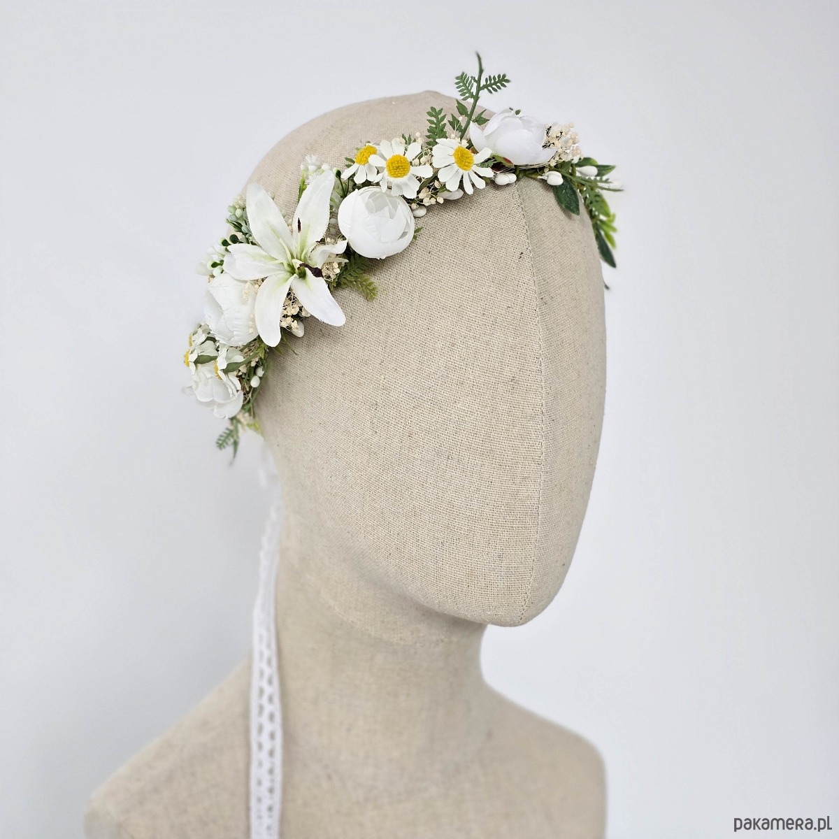 Uroczy, asymetryczny wianek na głowę, zdobiony syntetycznymi kwiatami i listkami. Możliwość regulacji wielkości obwodu, dzięki koronkowej tasiemce z tyłu. Będzie pasował zarówno na głowę dziecka, jak i osoby dorosłej. Ozdoba będzie idealna na Pierwszą Komunię Świętą. Wianek wykonany ręcznie, z najwyższą starannością, w pracowni "Lola White" w Polsce.