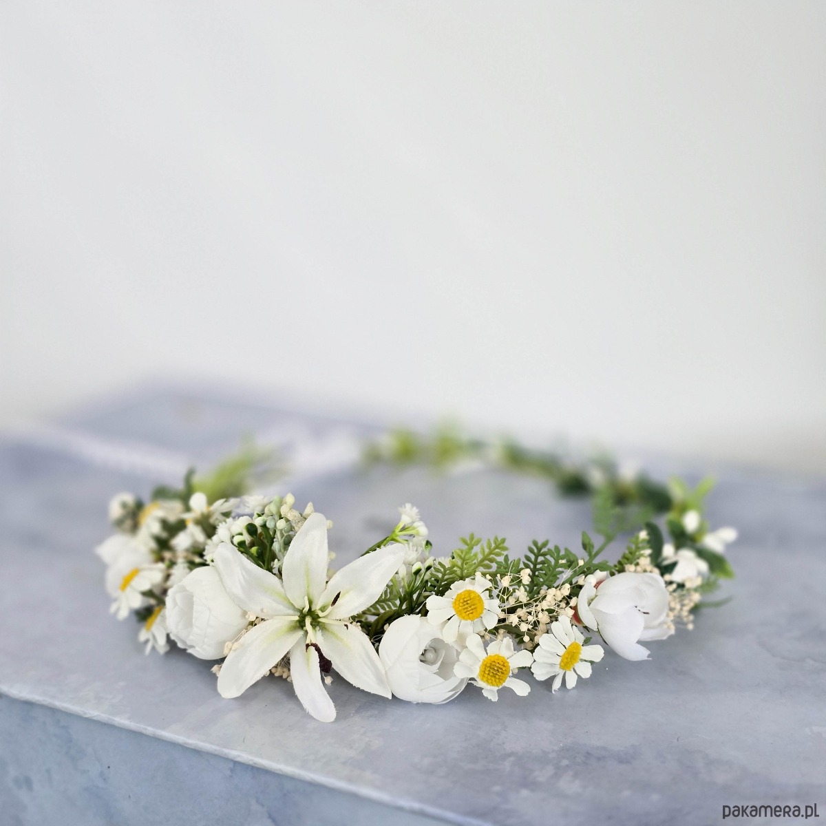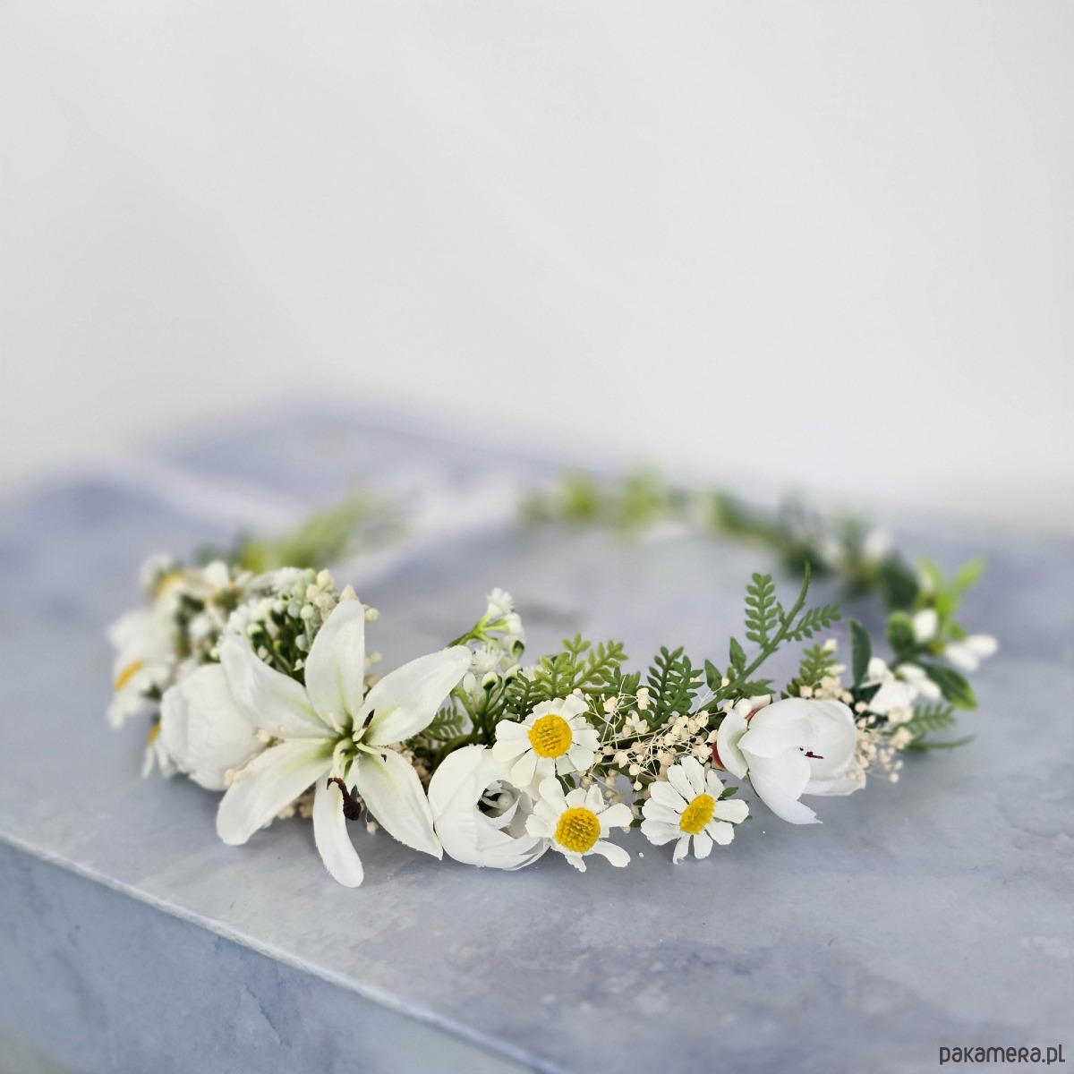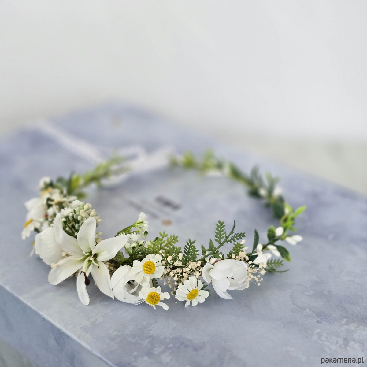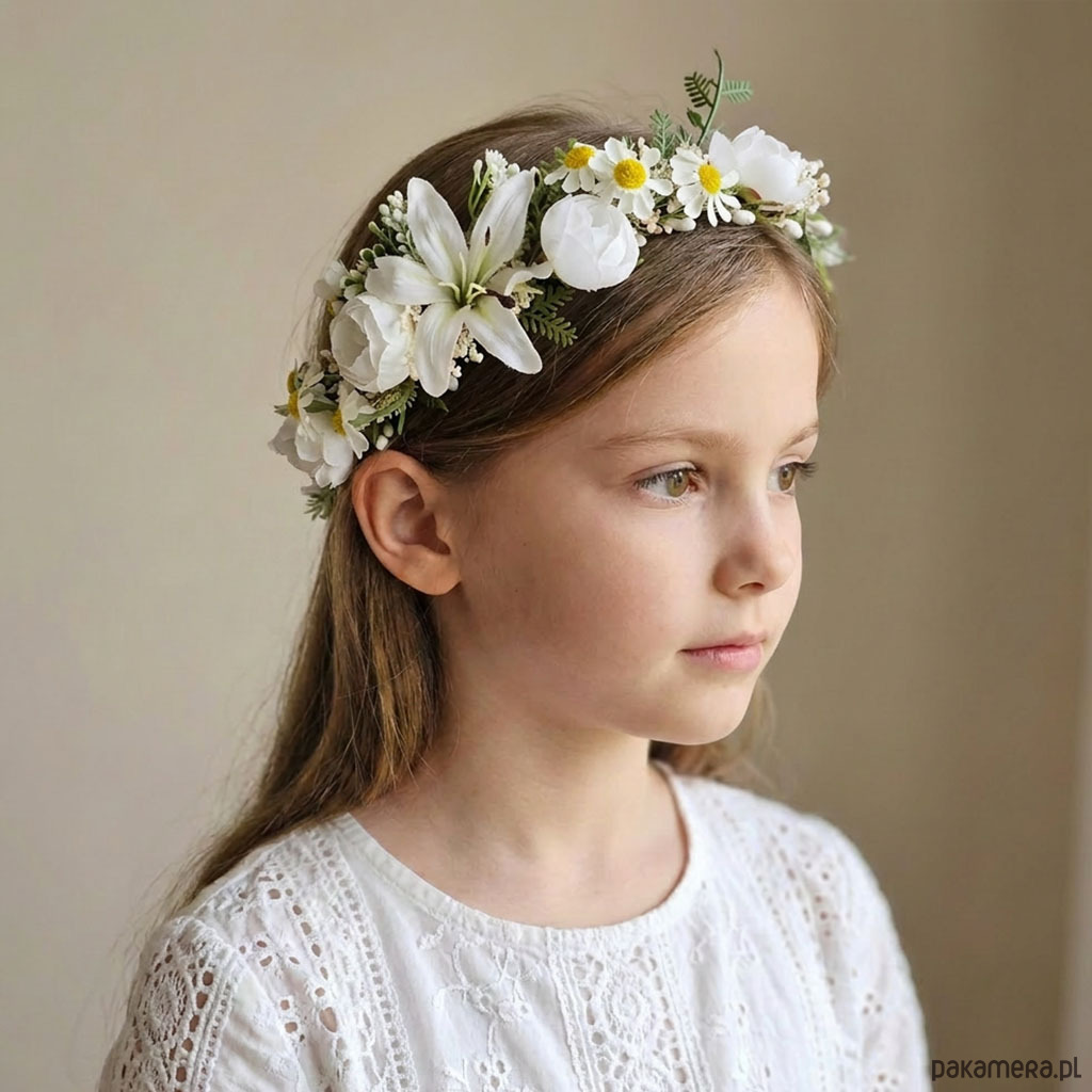 Uroczy, asymetryczny wianek na głowę, zdobiony syntetycznymi kwiatami i listkami. Możliwość regulacji wielkości obwodu, dzięki koronkowej tasiemce z tyłu. Będzie pasował zarówno na głowę dziecka, jak i osoby dorosłej. Ozdoba będzie idealna na Pierwszą Komunię Świętą. Wianek wykonany ręcznie, z najwyższą starannością, w pracowni "Lola White" w Polsce.