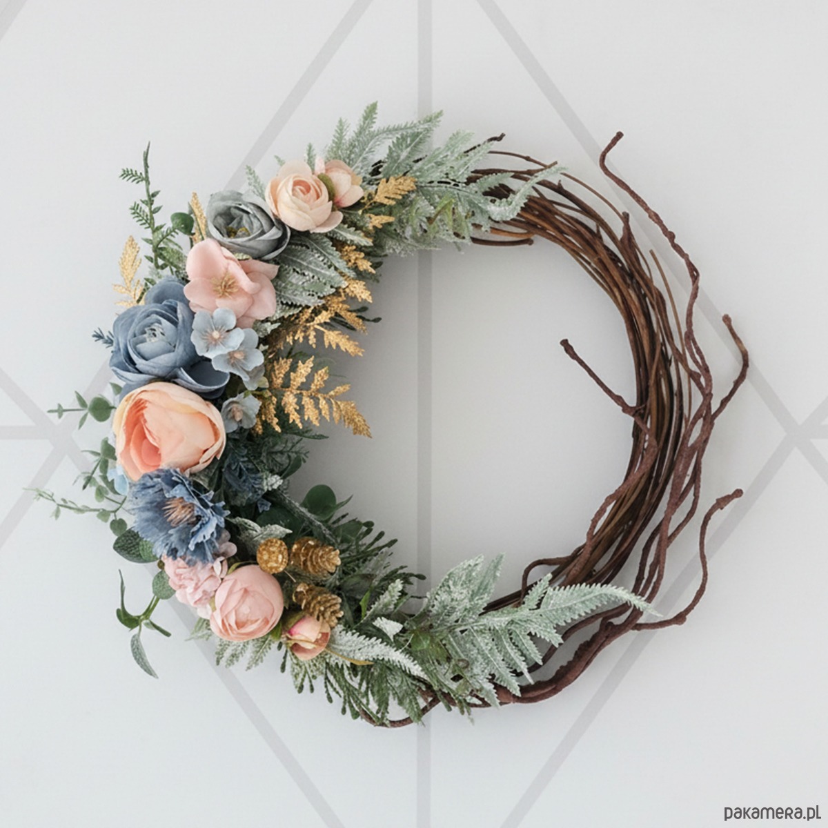 Piękny, asymetryczny wianek na drzwi, ścianę lub stół. Wykonany z wysokiej jakości syntetycznych gałązek oraz dodatków, więc przetrwa w doskonałym stanie kilka sezonów . Wianek wypleciony ręcznie, z najwyższą starannością, w pracowni "Lola White" w Polsce.