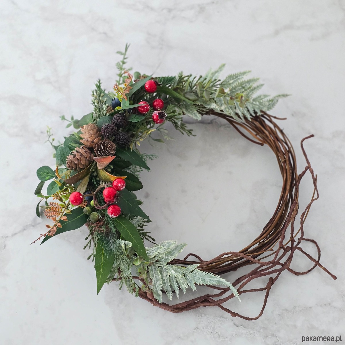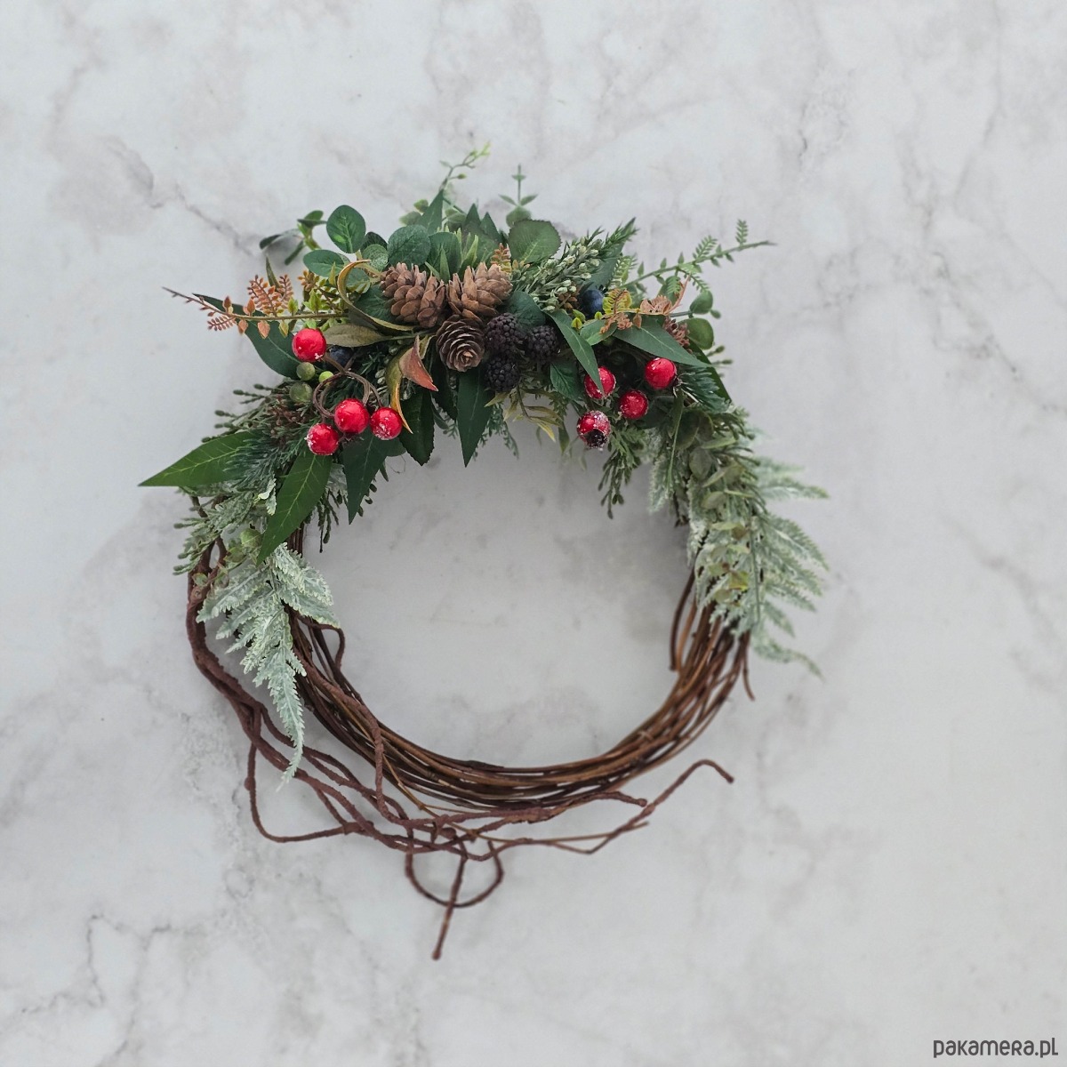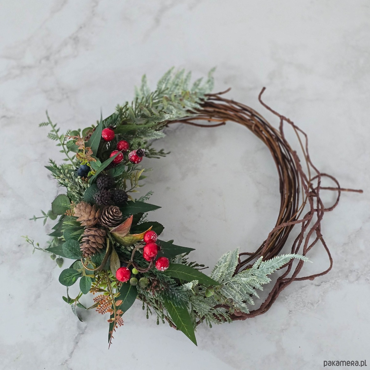 Piękny, asymetryczny wianek na drzwi, ścianę lub stół. Wykonany z wysokiej jakości syntetycznych gałązek oraz dodatków, więc przetrwa w doskonałym stanie kilka sezonów . Wianek wypleciony ręcznie, z najwyższą starannością, w pracowni "Lola White" w Polsce.