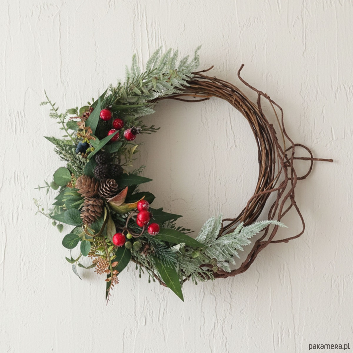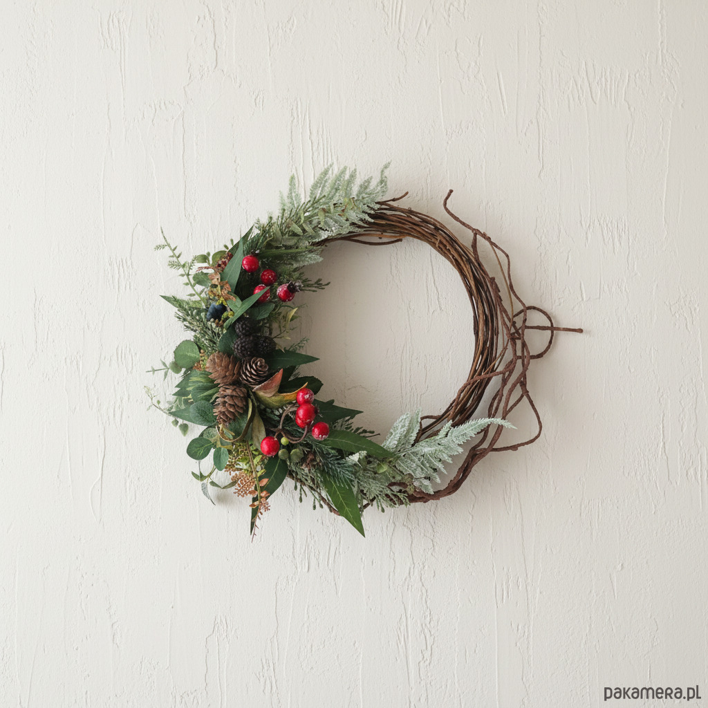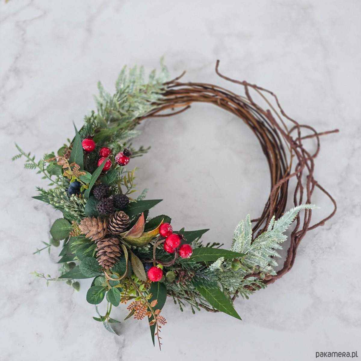 Piękny, asymetryczny wianek na drzwi, ścianę lub stół. Wykonany z wysokiej jakości syntetycznych gałązek oraz dodatków, więc przetrwa w doskonałym stanie kilka sezonów . Wianek wypleciony ręcznie, z najwyższą starannością, w pracowni "Lola White" w Polsce.