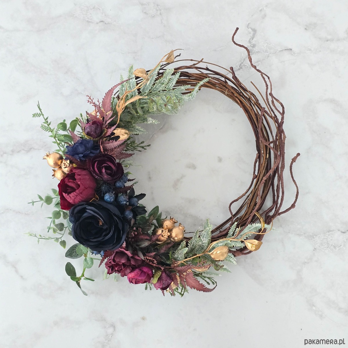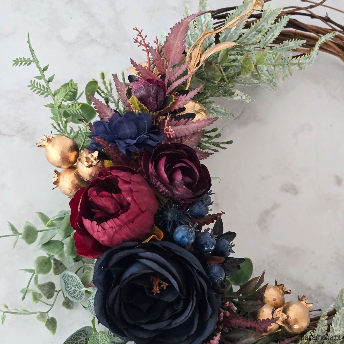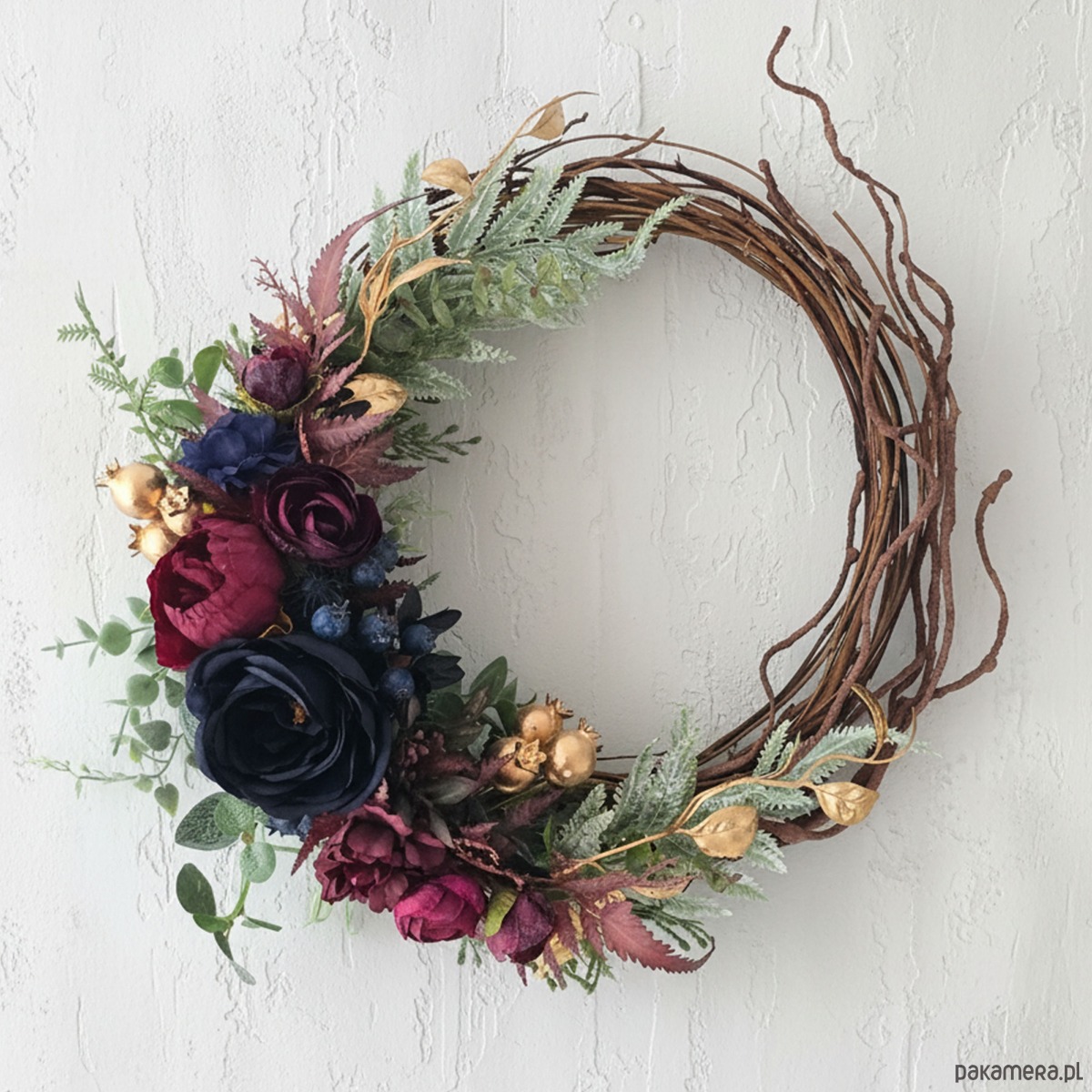 Piękny, asymetryczny wianek na drzwi, ścianę lub stół. Wykonany z wysokiej jakości syntetycznych gałązek oraz dodatków, więc przetrwa w doskonałym stanie kilka sezonów . Wianek wypleciony ręcznie, z najwyższą starannością, w pracowni "Lola White" w Polsce.