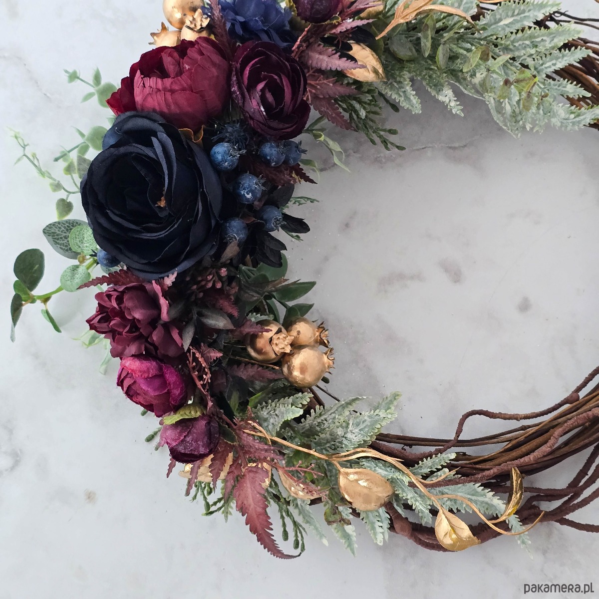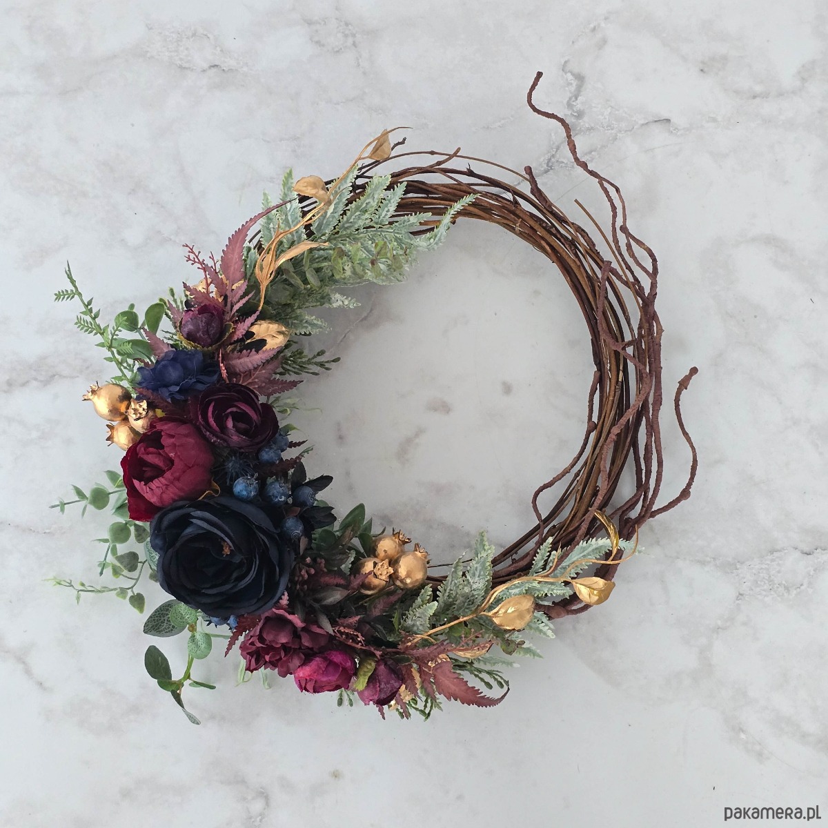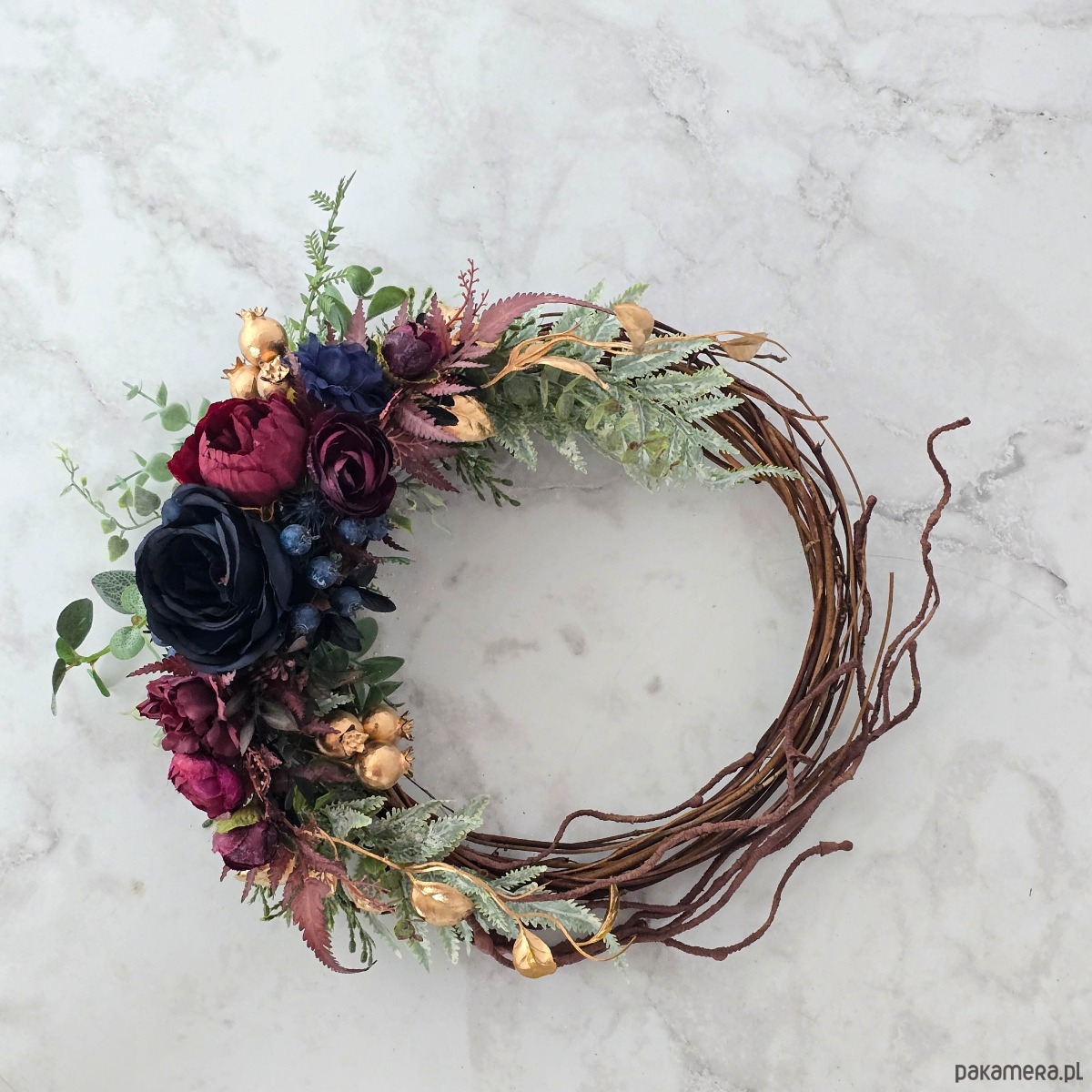 Piękny, asymetryczny wianek na drzwi, ścianę lub stół. Wykonany z wysokiej jakości syntetycznych gałązek oraz dodatków, więc przetrwa w doskonałym stanie kilka sezonów . Wianek wypleciony ręcznie, z najwyższą starannością, w pracowni "Lola White" w Polsce.