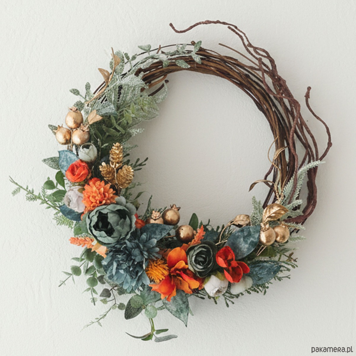 Piękny, asymetryczny wianek na drzwi, ścianę lub stół. Wykonany z wysokiej jakości syntetycznych gałązek oraz dodatków, więc przetrwa w doskonałym stanie kilka sezonów . Wianek wypleciony ręcznie, z najwyższą starannością, w pracowni "Lola White" w Polsce.