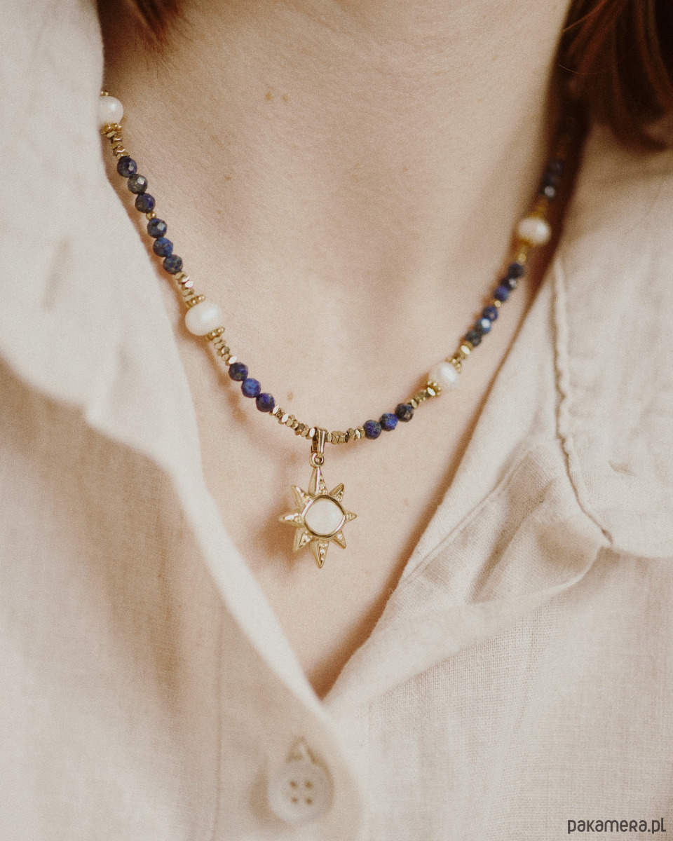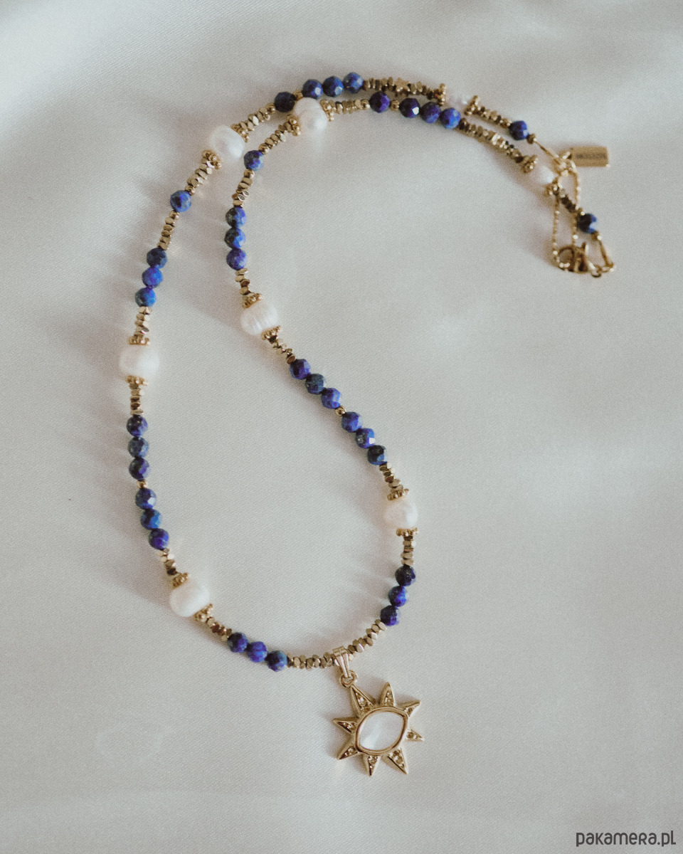 ᴀꜱʏʀɪᴜᴍ to naszyjnik wykonany z majestatycznego lapis lazuli, naturalnych pereł i złotego hematytu. Wykańcza go zawieszka w kształcie gwiazdy - oka. Inspiracją do tego projektu był styl mezopotamski, brama Ishtar oraz nowoczesny styl whimsical.