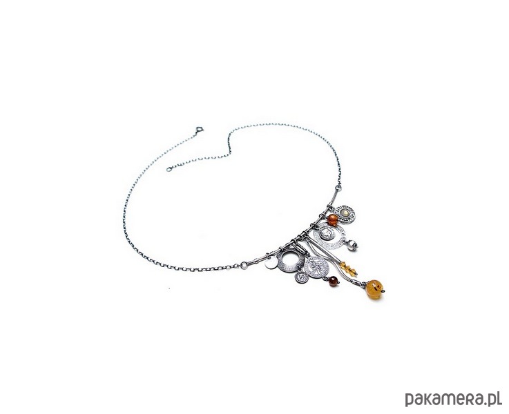 Naszyjnik wykonany ręcznie ze srebra [pr. 925] w połączeniu z fasetowaną kuleczką bursztynu [8mm], kuleczka bursztynu [10mm], turmalinu [5mm], kryształkami [3mm] oraz srebrnymi blaszkami, ogniwami i imitacjami monet. Srebro oksydowane i przetarte. Całkowita długość naszyjnika 50cm. Biżuteria ozdobnie zapakowana