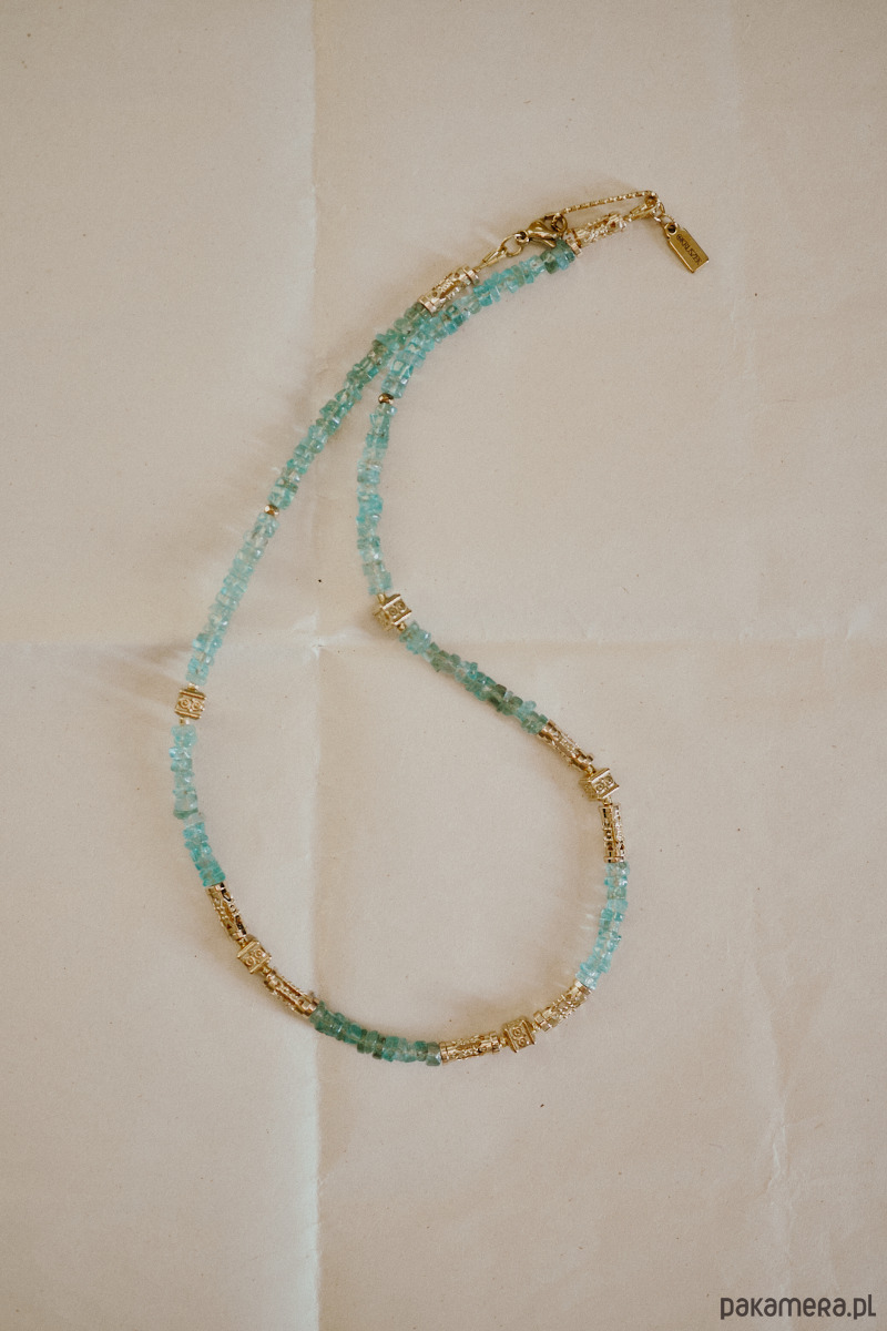 Składa się z przepięknie ciosanego w talarek apatytu w kolorze ciepłego morza i złotych przekładek nadających mu królewskiego i orientalnego charakteru. Z tym projektem na swojej szyi zachowasz lato na zawsze, a wszystkie morskie stworzenia będą Ci się kłaniać.