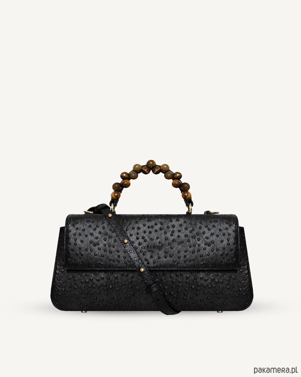 Torebka wykonana z naturalnej bydlęcej skóry tłoczonej na wzór strusia, wykończona materiałową wodoodporną podszewką. Zapinana na dwa magnesy i suwak. W środku znajdują się dwie kieszenie, duża kieszeń wielkości torebki, zapinana na suwak pod klapą i otwarta wewnątrz torby przedzielona na pół. Na zewnętrznej stronie torby duża kieszeń zapinana na suwak. Na dnie pięć metalowych nóżek, które chronią torbę przed zniszczeniem. Posiada skórzany pasek z dużą możliwością regulacji długości. Rączka ozdobiona ręcznie przyszywanym fasetowanym tygrysim okiem, pięknie odbijającym światło.