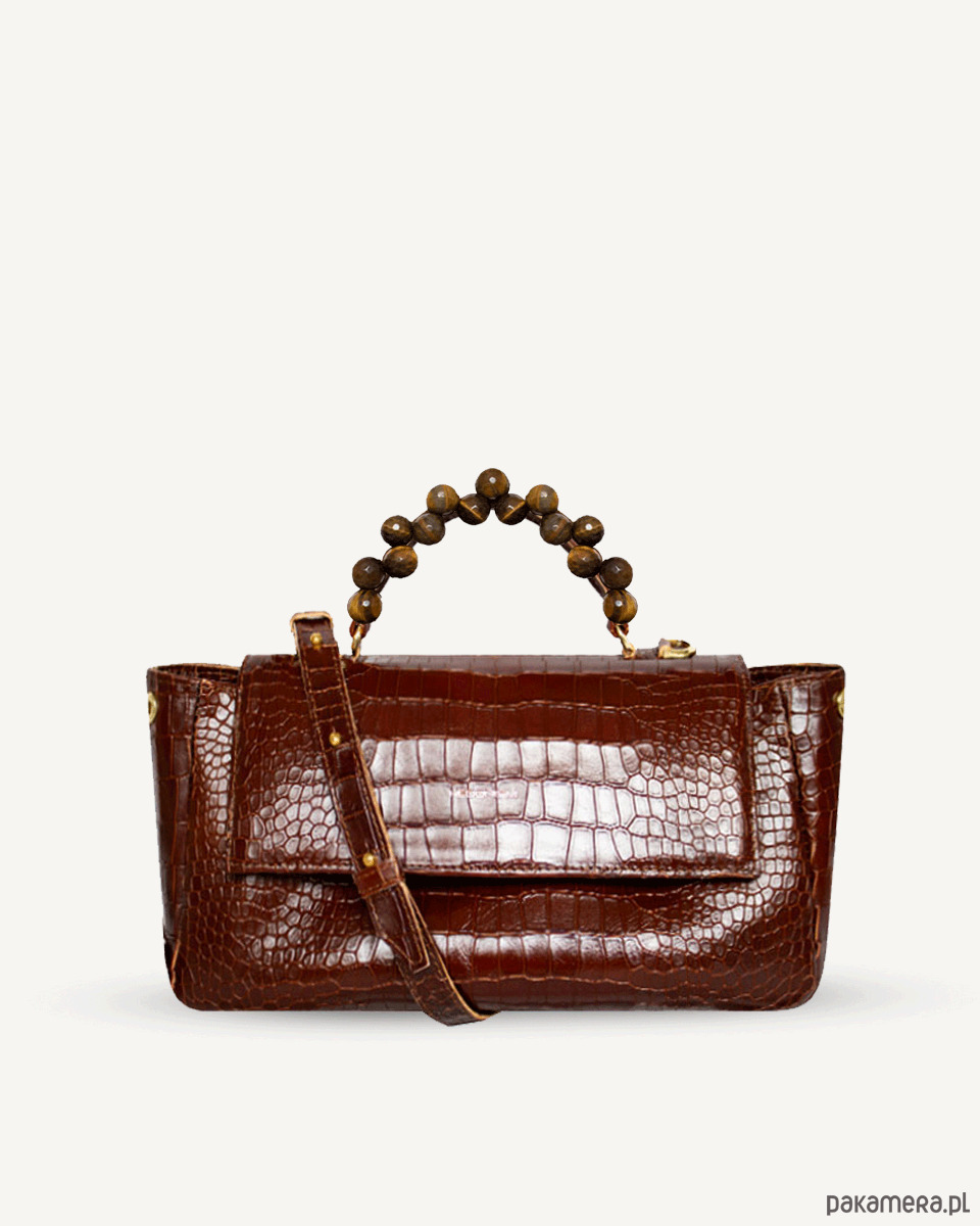 Torebka wykonana z naturalnej satynowej skóry tłoczonej na wzór krokodyla, wykończona materiałową podszewką. Zapinana na dwa magnesy i suwak. W środku znajdują się dwie kieszenie, duża kieszeń wielkości torebki, zapinana na suwak pod klapą i otwarta wewnątrz torby przedzielona na pół. Na zewnętrznej stronie torby duża kieszeń zapinana na suwak. Na dnie pięć metalowych nóżek, które chronią torbę przed zniszczeniem. Posiada skórzany pasek z dużą możliwością regulacji długości. Rączka ozdobiona fasetowanym tygrysim okiem.