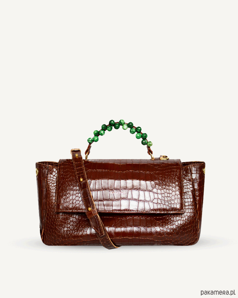 Torebka wykonana z naturalnej satynowej skóry tłoczonej na wzór krokodyla, wykończona materiałową podszewką. Zapinana na dwa magnesy i suwak. W środku znajdują się dwie kieszenie, duża kieszeń wielkości torebki, zapinana na suwak pod klapą i otwarta wewnątrz torby przedzielona na pół. Na zewnętrznej stronie torby duża kieszeń zapinana na suwak. Na dnie pięć metalowych nóżek, które chronią torbę przed zniszczeniem. Posiada skórzany pasek z dużą możliwością regulacji długości. Rączka ozdobiona fasetowanym malachitem.