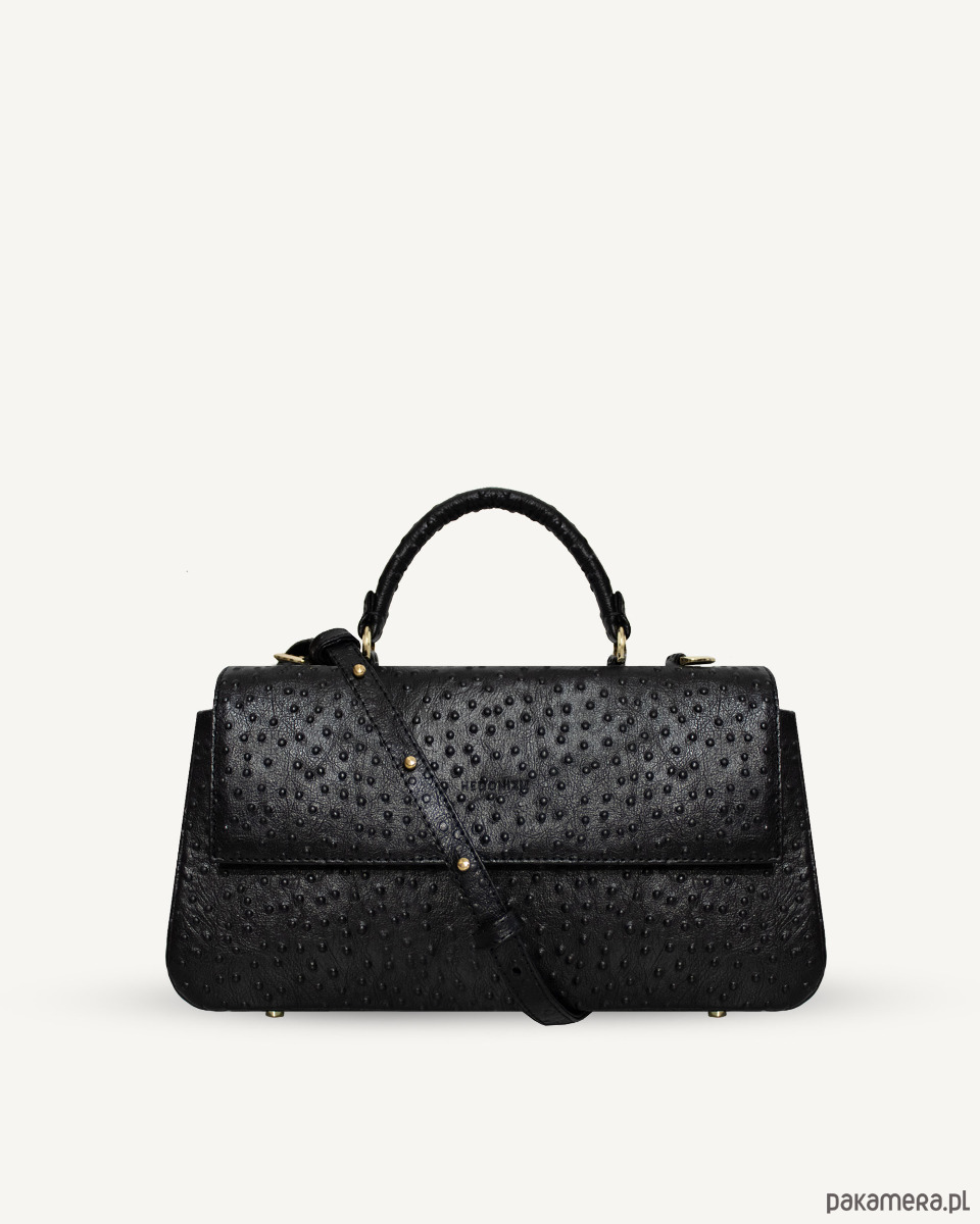 Torebka wykonana z naturalnej bydlęcej skóry tłoczonej na wzór strusia, wykończona materiałową wodoodporną podszewką. Zapinana na dwa magnesy i suwak. W środku znajdują się dwie kieszenie. Duża kieszeń wielkości torebki zapinana na suwak i otwarta przedzielona na pół. Na zewnętrznej stronie torby duża kieszeń zapinana na suwak. Na dnie pięć metalowych nóżek, które chronią torbę przed zniszczeniem. Posiada skórzany pasek z dużą możliwością regulacji długości.