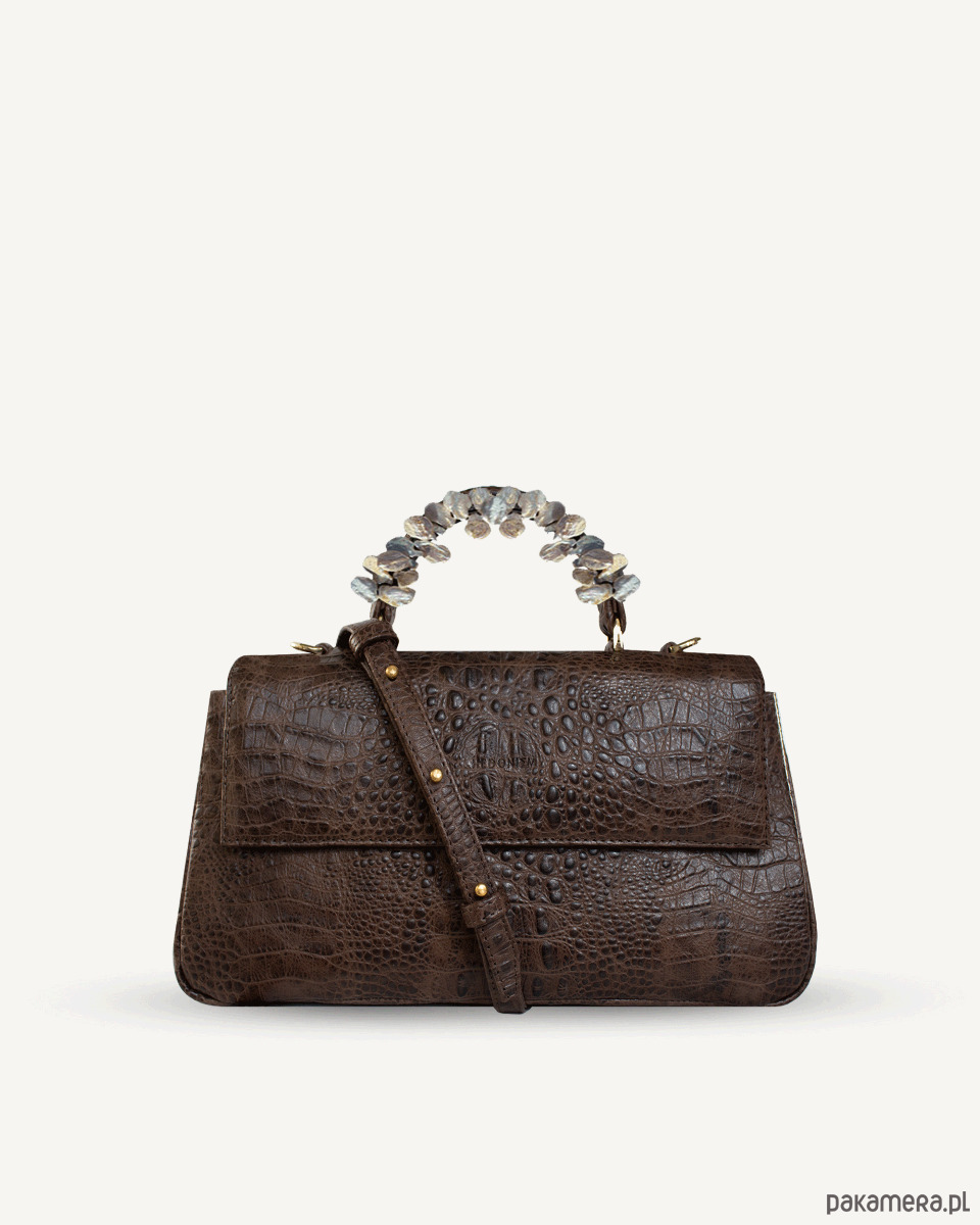 Torebka wykonana z naturalnej satynowej skóry tłoczonej na wzór krokodyla, wykończona materiałową wodoodporną podszewką. Zapinana na dwa magnesy i suwak. W środku znajdują się dwie kieszenie, duża kieszeń wielkości torebki, zapinana na suwak pod klapą i otwarta wewnątrz torby przedzielona na pół. Na zewnętrznej stronie torby duża kieszeń zapinana na suwak. Rączka ozdobiona ręcznie przyszywanymi naturalnymi słodkowodnymi perłami w kremowym kolorze . Na dnie pięć metalowych nóżek, które chronią torbę przed zniszczeniem. Posiada skórzany pasek z dużą możliwością regulacji długości.
