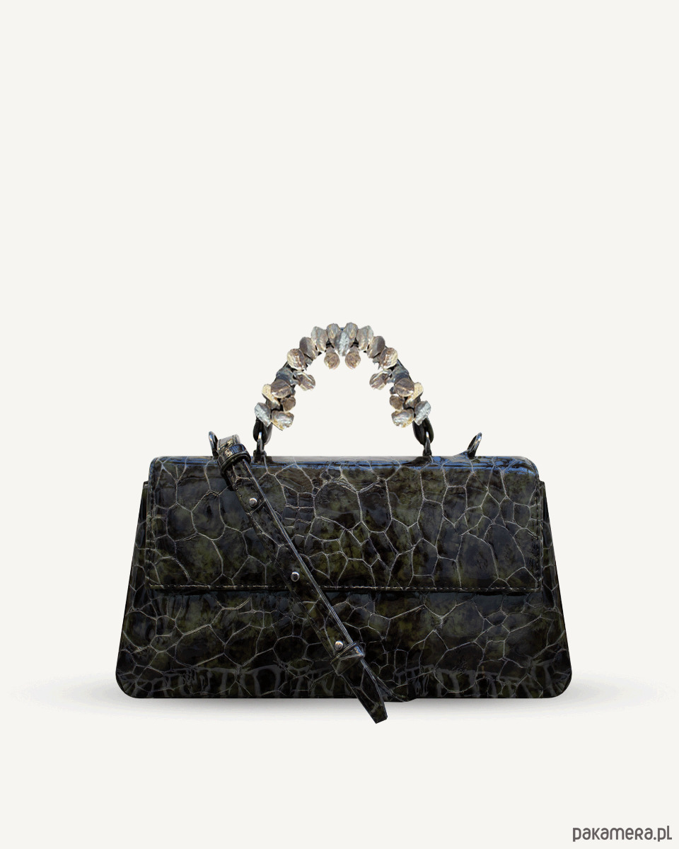 Torebka wykonana z naturalnej lakierowanej skóry tłoczonej na wzór krokodyla, wykończona materiałową wodoodporną podszewką. Zapinana na dwa magnesy i suwak. W środku znajdują się dwie kieszenie, duża kieszeń wielkości torebki, zapinana na suwak pod klapą i otwarta wewnątrz torby przedzielona na pół. Na zewnętrznej stronie torby duża kieszeń zapinana na suwak. Rączka ozdobiona ręcznie przyszywanymi naturalnymi słodkowodnymi perłami w kremowym kolorze . Na dnie pięć metalowych nóżek, które chronią torbę przed zniszczeniem. Posiada skórzany pasek z dużą możliwością regulacji długości.