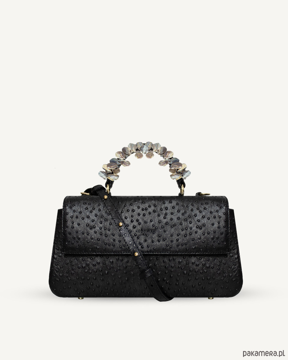Torebka wykonana z naturalnej bydlęcej skóry tłoczonej na wzór strusia, wykończona materiałową wodoodporną podszewką. Zapinana na dwa magnesy i suwak. W środku znajdują się dwie kieszenie, duża kieszeń wielkości torebki, zapinana na suwak pod klapą i otwarta wewnątrz torby przedzielona na pół. Na zewnętrznej stronie torby duża kieszeń zapinana na suwak. Rączka ozdobiona ręcznie przyszywanymi naturalnymi słodkowodnymi perłami w kremowym kolorze . Na dnie pięć metalowych nóżek, które chronią torbę przed zniszczeniem. Posiada skórzany pasek z dużą możliwością regulacji długości.