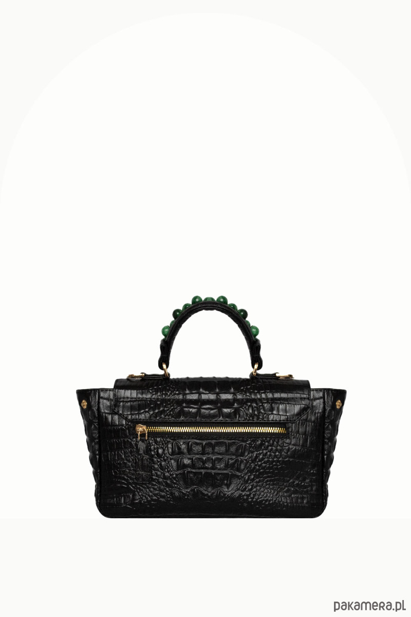 Torebka wykonana z naturalnej satynowej skóry tłoczonej na wzór krokodyla, wykończona materiałową podszewką. Zapinana na dwa magnesy i suwak. W środku znajdują się dwie kieszenie, duża kieszeń wielkości torebki, zapinana na suwak pod klapą i otwarta wewnątrz torby przedzielona na pół. Na zewnętrznej stronie torby duża kieszeń zapinana na suwak. Rączka ozdobiona ręcznie przyszywanymi naturalnymi malachitami. Na dnie pięć metalowych nóżek, które chronią torbę przed zniszczeniem. Posiada skórzany pasek z dużą możliwością regulacji długości.