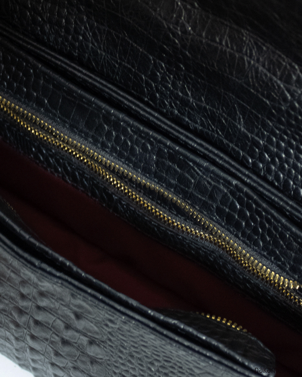 Torebka wykonana z naturalnej satynowej skóry tłoczonej na wzór krokodyla, wykończona materiałową wodoodporną podszewką. Zapinana na dwa magnesy i suwak. W środku znajdują się dwie kieszenie, duża kieszeń wielkości torebki, zapinana na suwak pod klapą i otwarta wewnątrz torby przedzielona na pół. Na zewnętrznej stronie torby duża kieszeń zapinana na suwak. Rączka ozdobiona ręcznie przyszywanym naturalnym, fasetowanym tygrysim okiem. Na dnie pięć metalowych nóżek, które chronią torbę przed zniszczeniem. Posiada skórzany pasek z dużą możliwością regulacji długości.