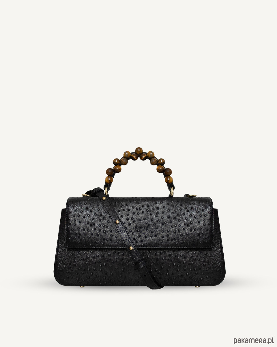 Torebka wykonana z naturalnej bydlęcej skóry tłoczonej na wzór strusia, wykończona materiałową wodoodporną podszewką. Zapinana na dwa magnesy i suwak. W środku znajdują się dwie kieszenie, duża kieszeń wielkości torebki, zapinana na suwak pod klapą i otwarta wewnątrz torby przedzielona na pół. Na zewnętrznej stronie torby duża kieszeń zapinana na suwak. Na dnie pięć metalowych nóżek, które chronią torbę przed zniszczeniem. Posiada skórzany pasek z dużą możliwością regulacji długości. Rączka ozdobiona ręcznie przyszywanym fasetowanym tygrysim okiem, pięknie odbijającym światło.