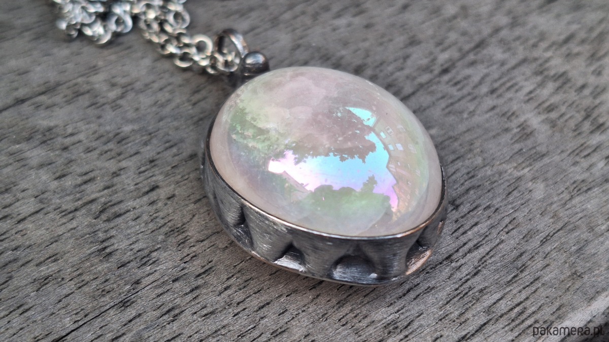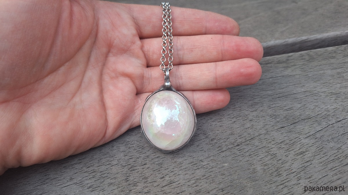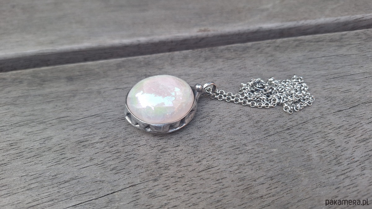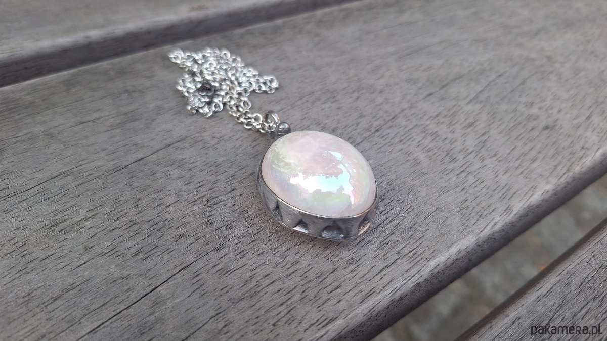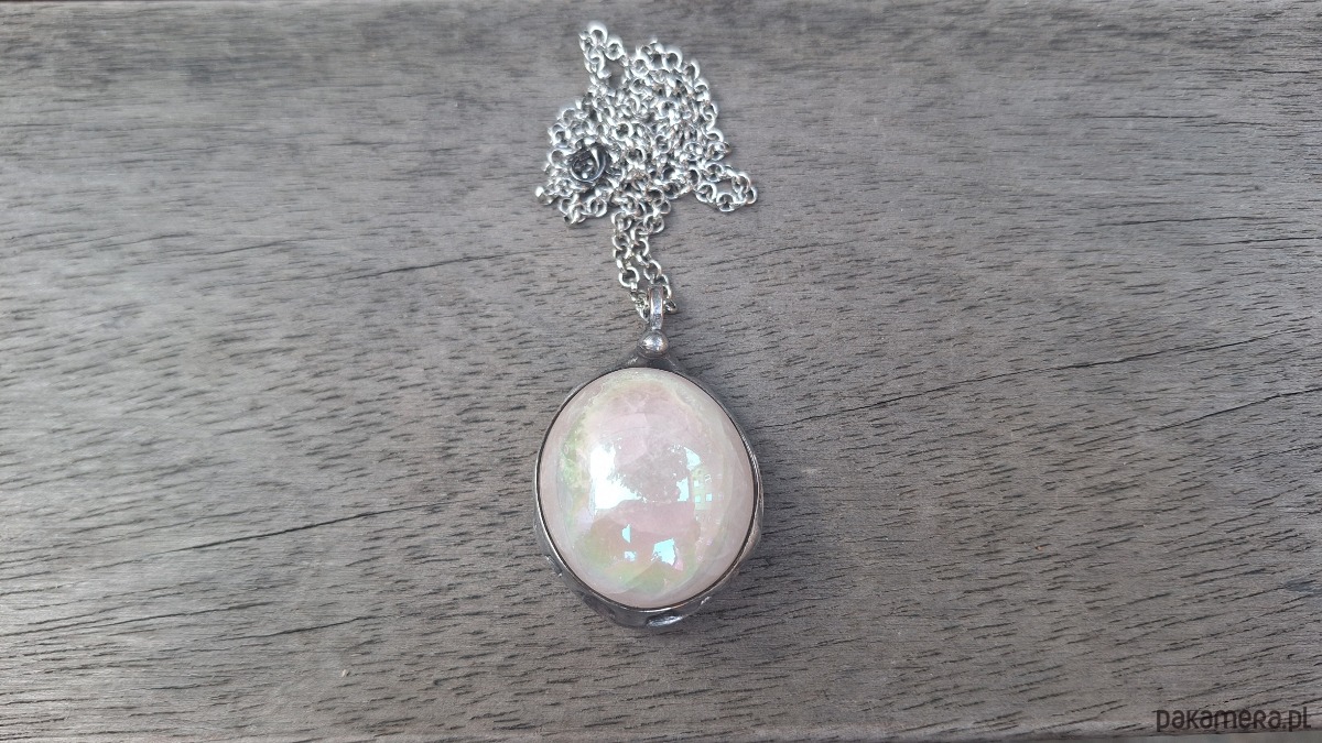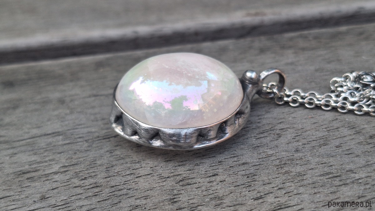 Wisiorek wykonany z miedzi, cyny i kryształu górskiego z aurą anielską. Wymiary ok. 4 na 3 cm. Zawieszony na łańcuszku o długości ok. 50 cm.