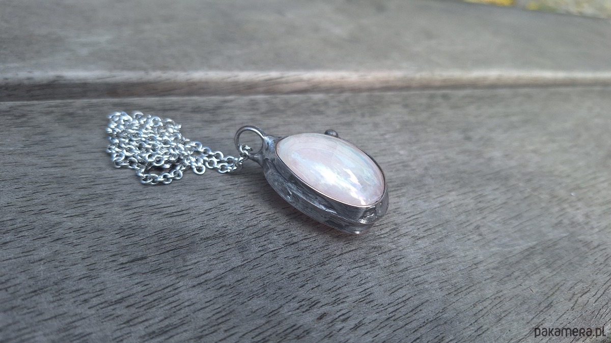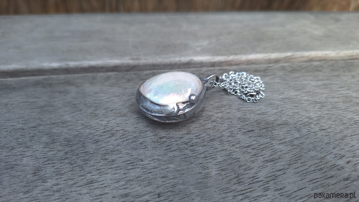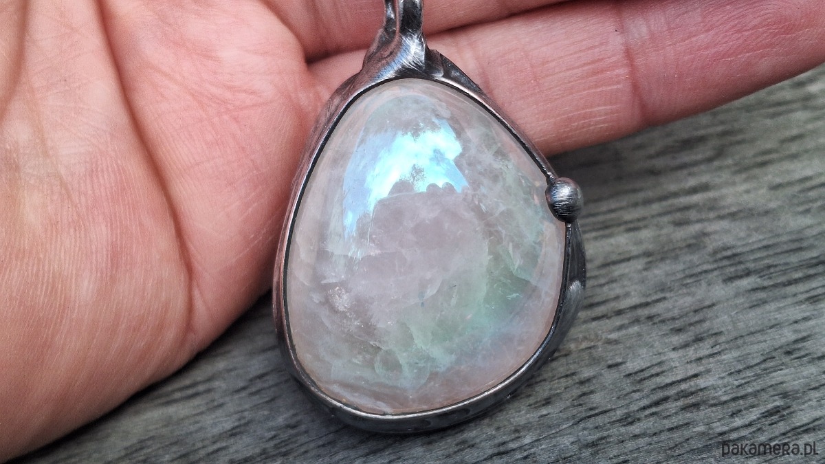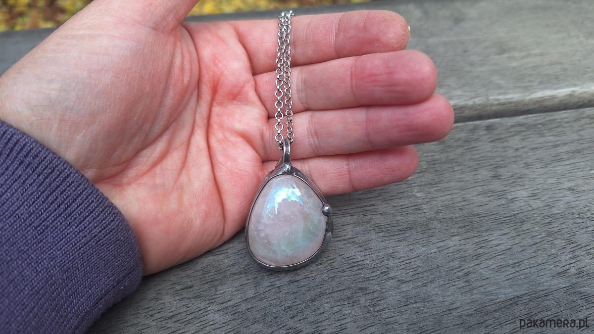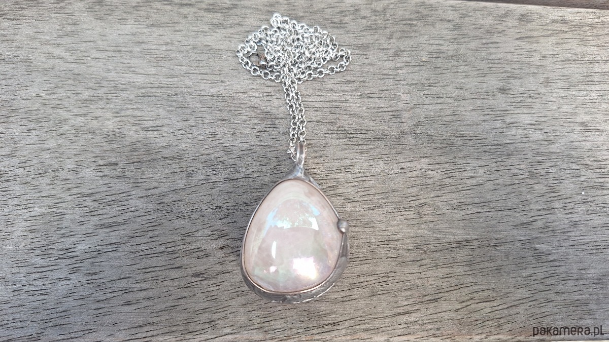Wisiorek wykonany z miedzi, cyny i kryształu górskiego z aurą anielską. Wymiary ok. 3.5 na 3 cm. Zawieszony na łańcuszku o długości ok. 50 cm.