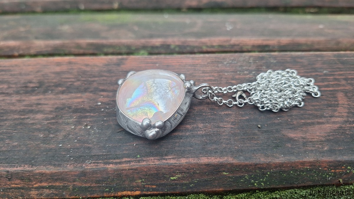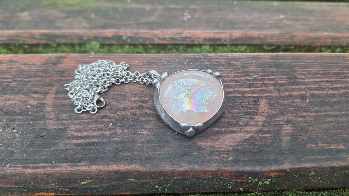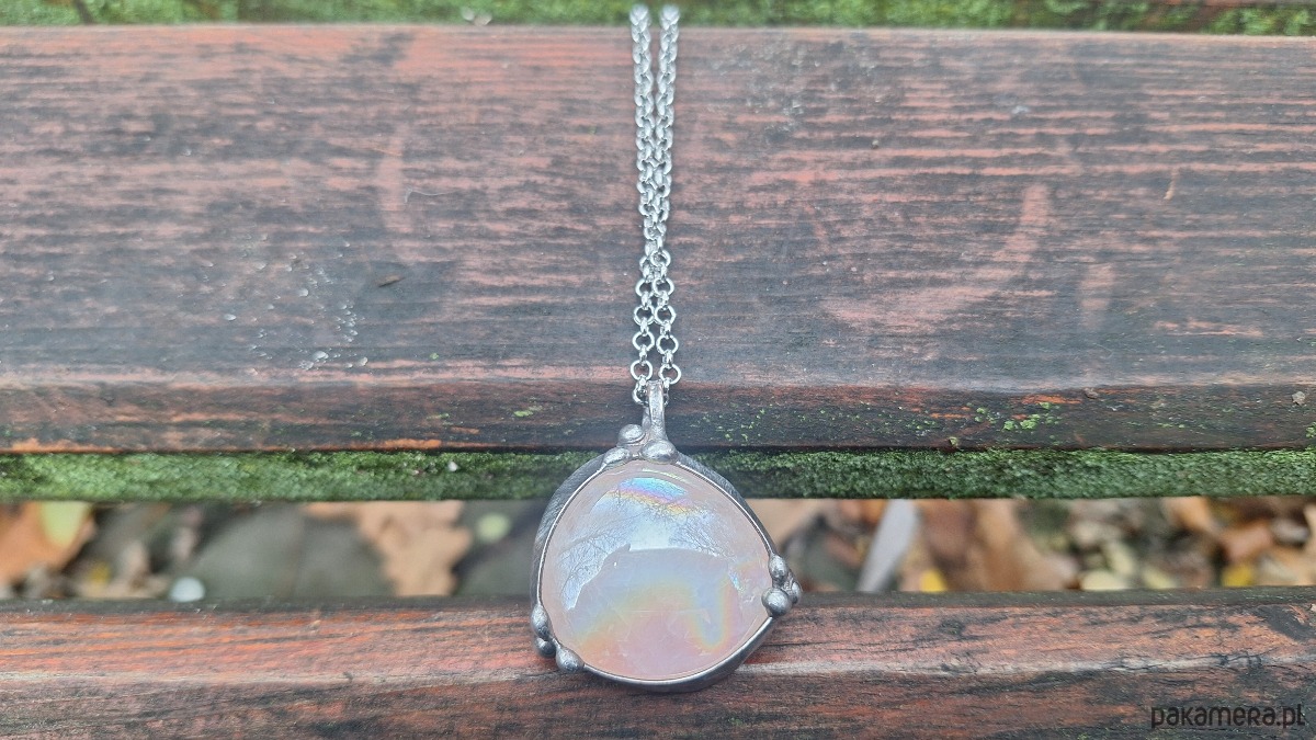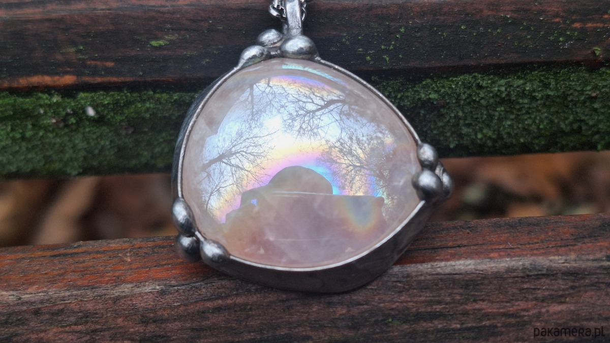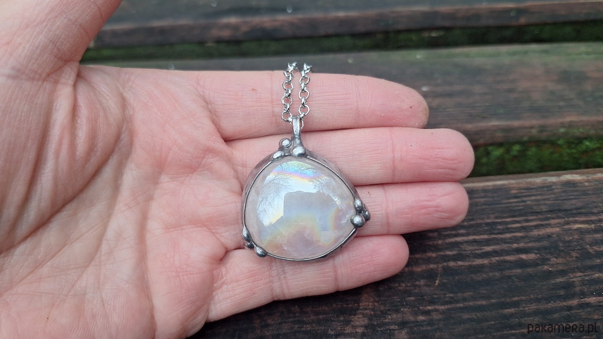 Wisiorek wykonany z miedzi, cyny i kryształu górskiego z aurą anielską. Wymiary ok. 3 na 3 cm. Zawieszony na łańcuszku o długości ok. 50 cm.