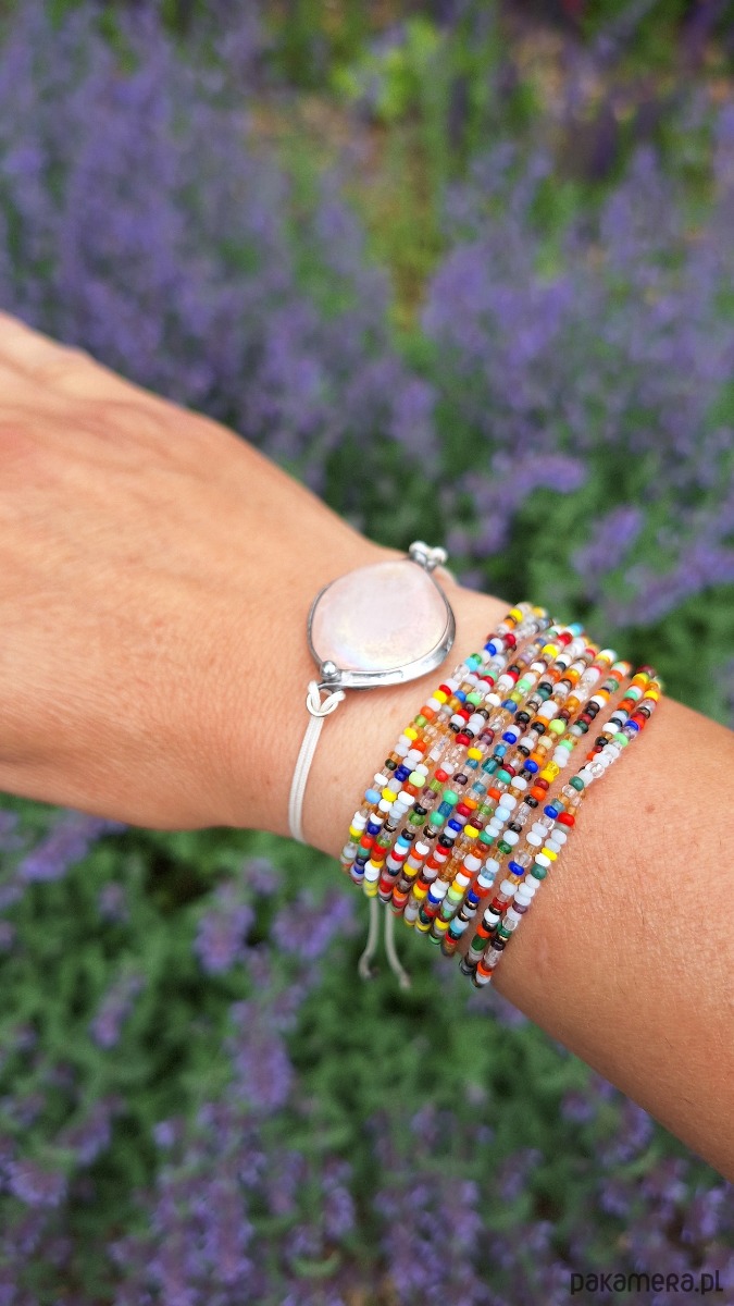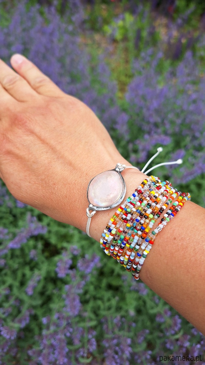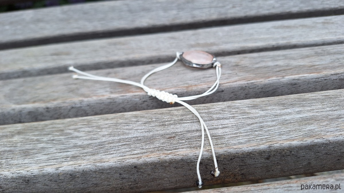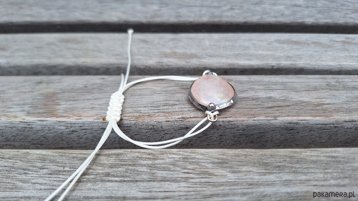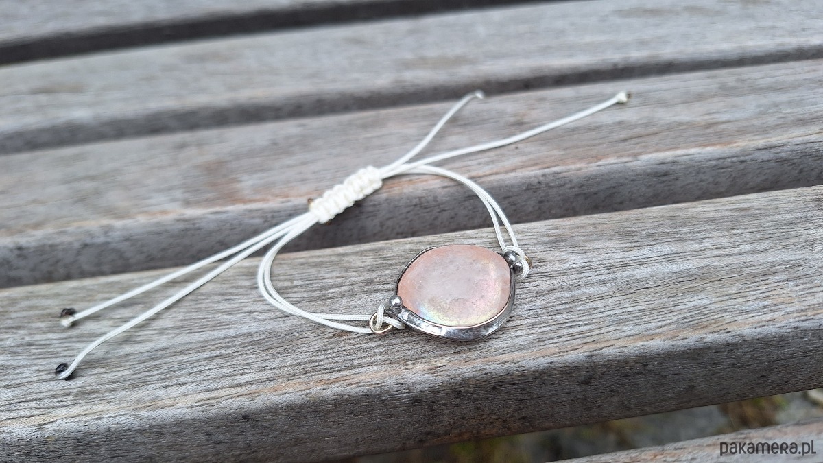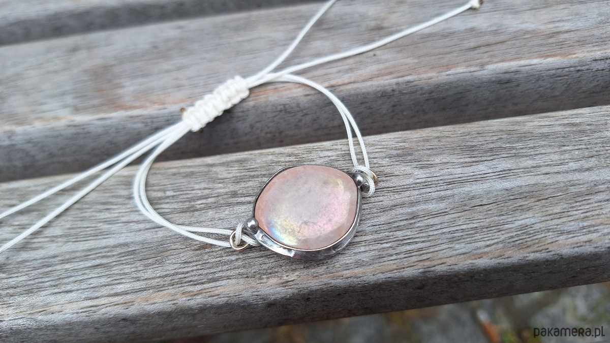 Lekka, wiosenno- letnia bransoletka wykonana z miedzi, cyny i kryształu górskiego z aurą anielską. Wymiary kamienia ok. 2.5 na 2.2 cm; regulowana poprzez zaciągnięcie, na sznureczku.