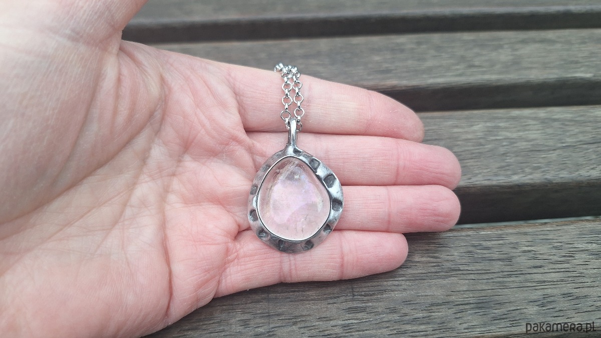 Wisiorek wykonany z miedzi, cyny i kryształu górskiego z aurą anielską. Wymiary ok. 3 na 2.5 cm. Zawieszony na łańcuszku o długości ok. 50 cm.