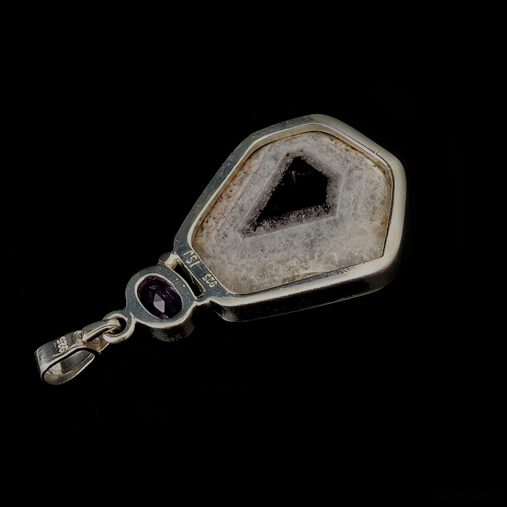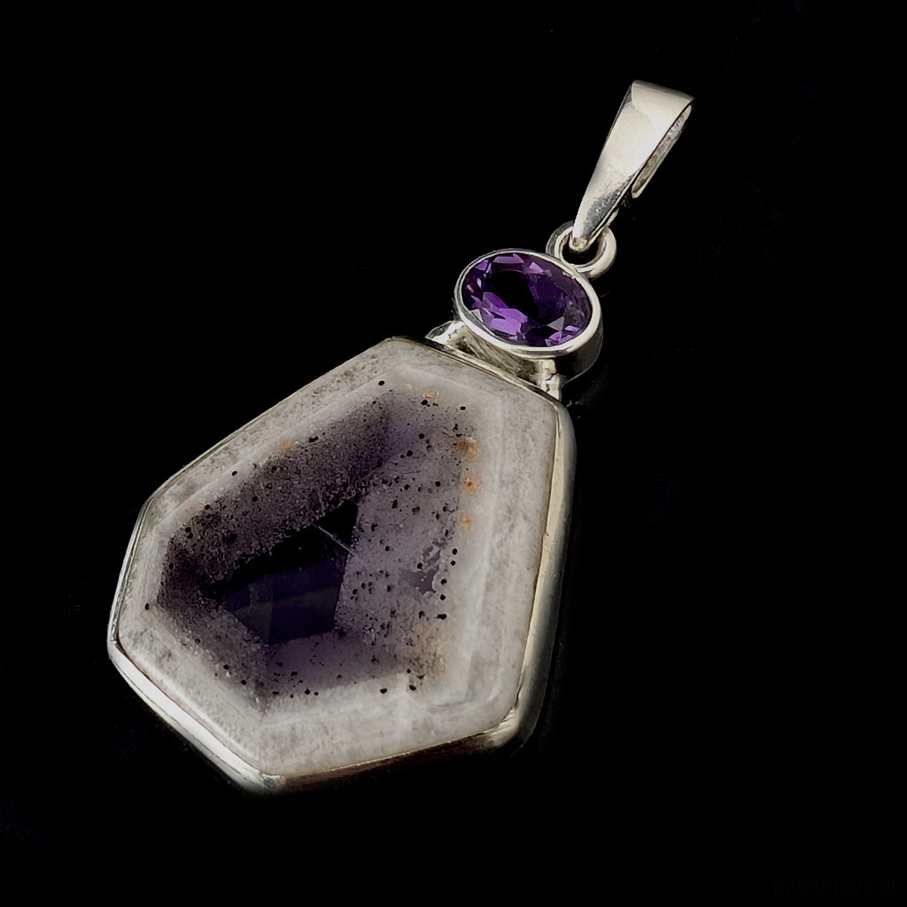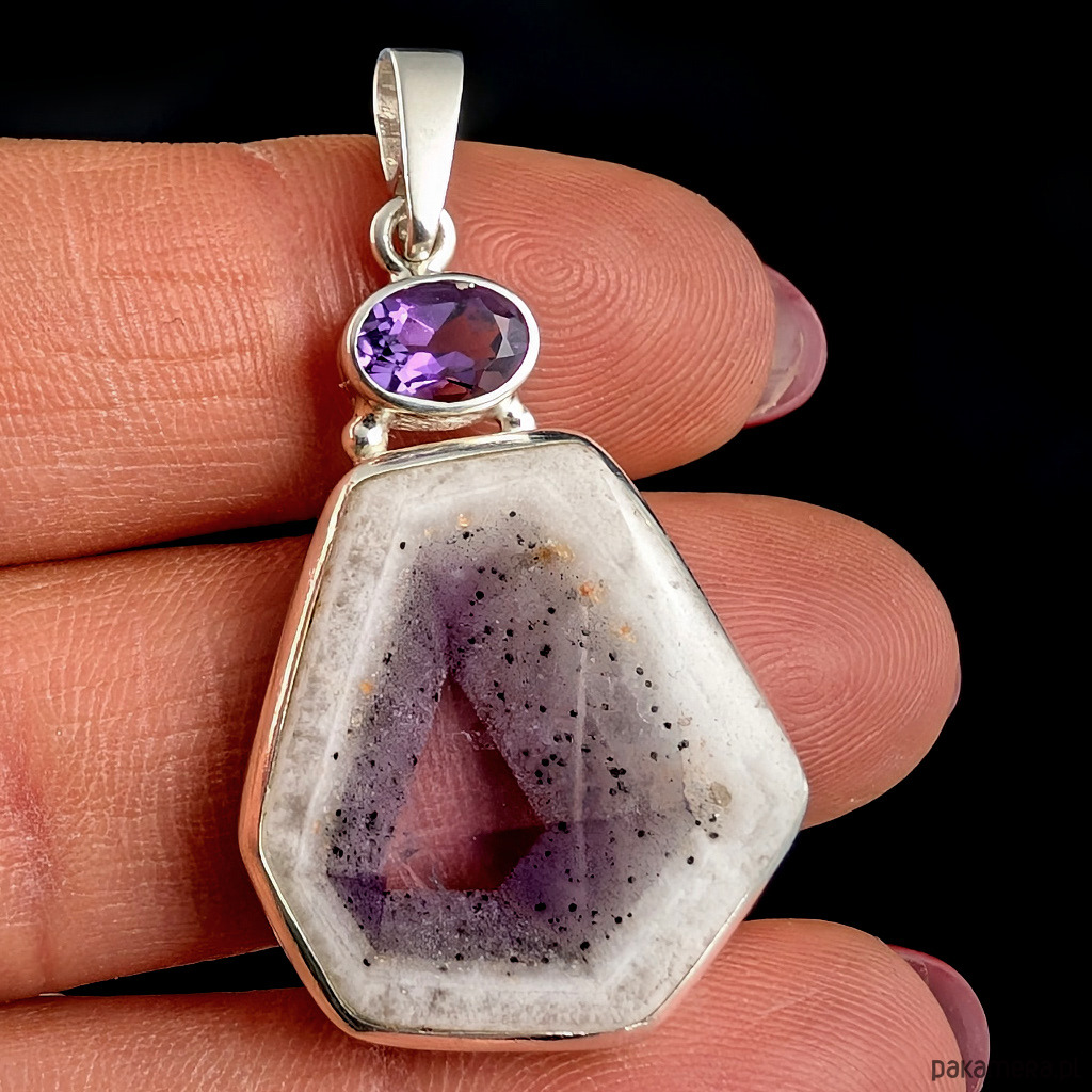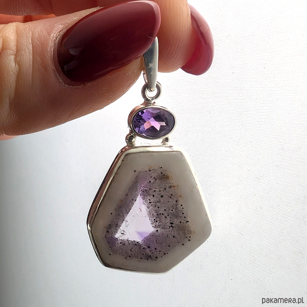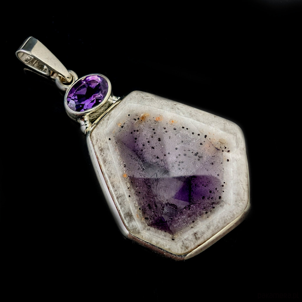 Oryginalny wisiorek wykonany ze srebra próby 925 oraz pięknego, bardzo rzadkeigo auralitu, będącego połączeniem minerałów i metali z przewagą ametystu i kwarcu. Kamień z pięknym przeźroczem. Towarzyszy mu fasetowany ametyst. Wymiary wisiorka 32 x 22 mm. Z krawatką max 39 mm. Waga 7,3 grama. Wykonany przez dostawcę kamieni. Zawieszka zostanie zapakowana w ozdobne pudełeczko.