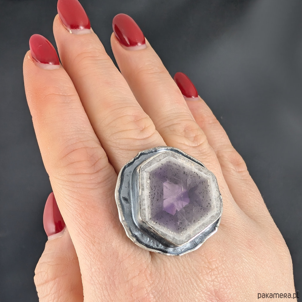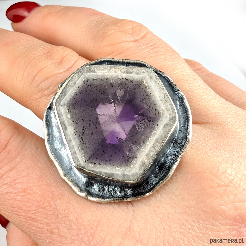 Oryginalny pierścień wykonany z oksydowanego srebra próby 925 oraz pięknego, bardzo rzadkeigo auralitu, będącego połączeniem minerałów i metali z przewagą ametystu i kwarcu. Kamień z pięknym przeźroczem. Towarzyszy mu fasetowany ametyst. Wymiary wisiorka 33 x 32 mm. Rozmiar jubilerski 20 mogę powiększyć na max 21. Waga 17,3 grama. Pierścień zostanie zapakowany w ozdobne pudełeczko.