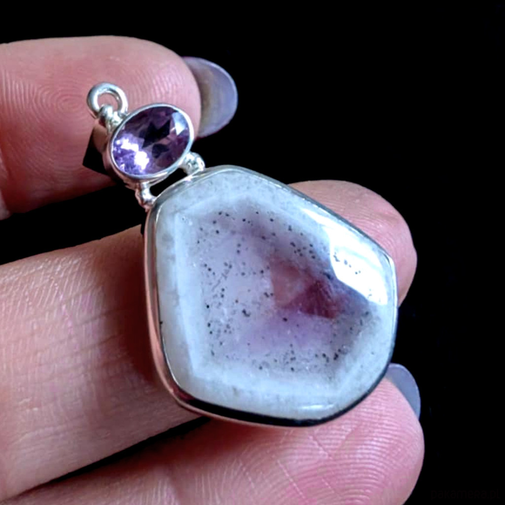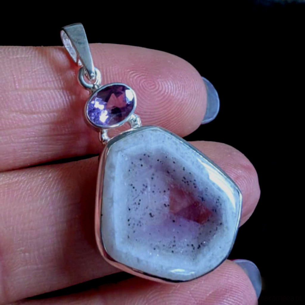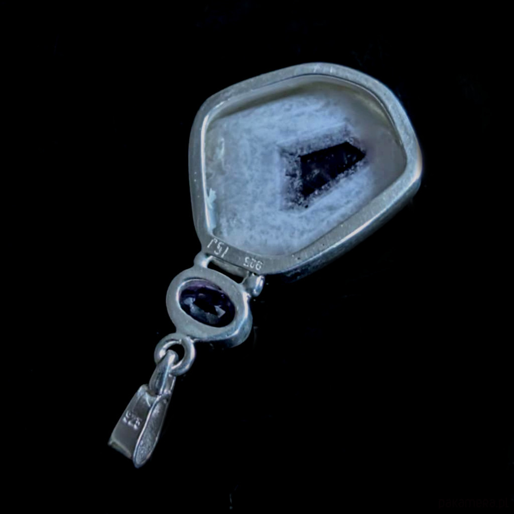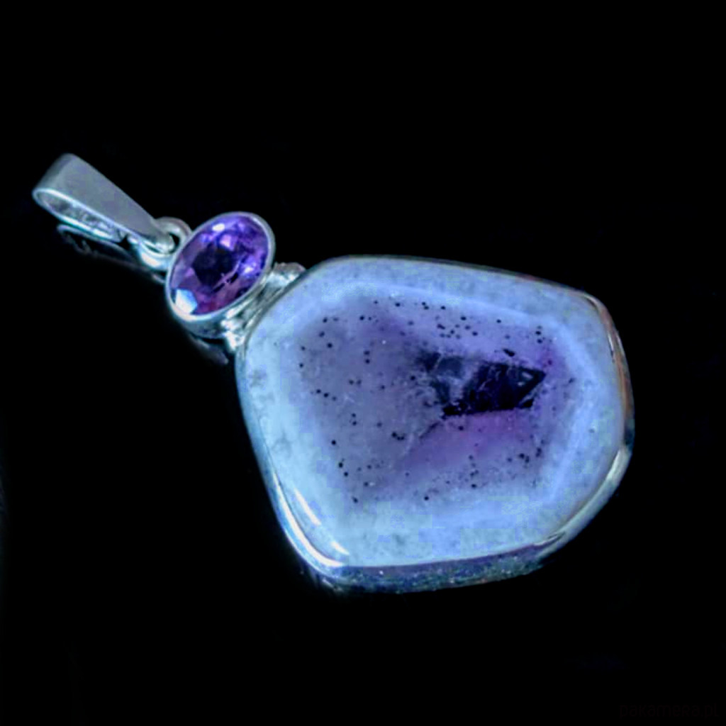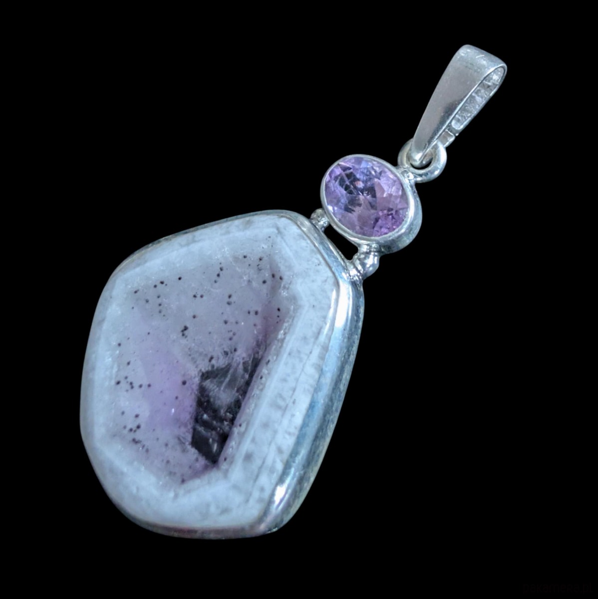 Oryginalny wisiorek wykonany ze srebra próby 925 oraz pięknego, bardzo rzadkeigo auralitu, będącego połączeniem minerałów i metali z przewagą ametystu i kwarcu. Kamień z pięknym przeźroczem. Towarzyszy mu fasetowany ametyst. Wymiary wisiorka 30 x 22 mm. Z krawatką max 42 mm. Waga 6,45 grama. Wykonany przez dostawcę kamieni. Zawieszka zostanie zapakowana w ozdobne pudełeczko.