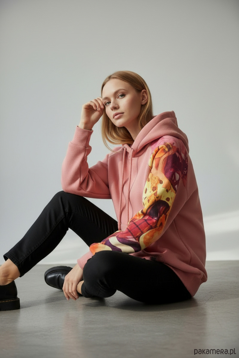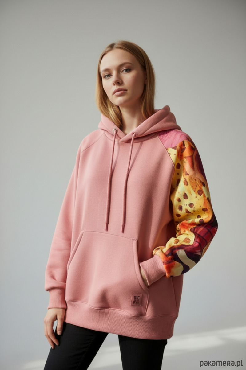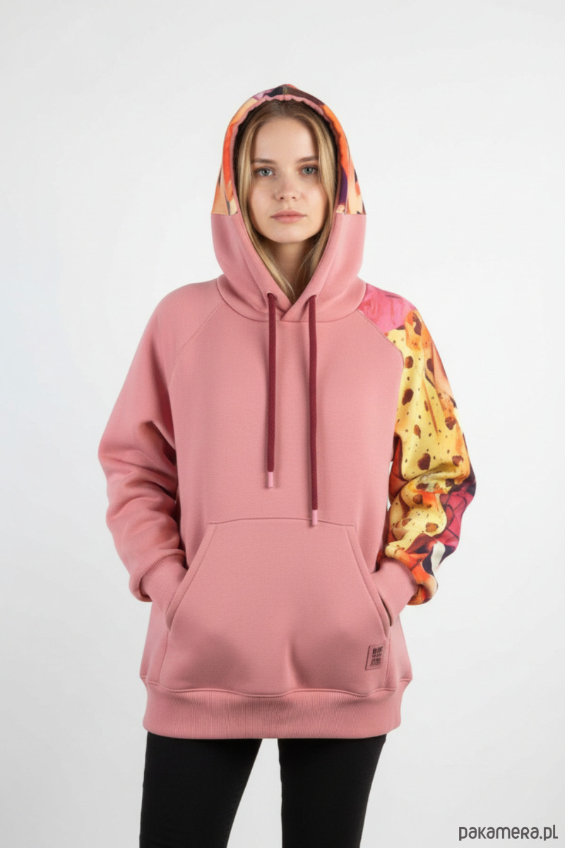 Bluza ma duży kaptur oraz kieszeń typu kangurka, dzięki czemu jest nie tylko stylowa, ale też bardzo praktyczna. Jeden rękaw oraz połowa kaptura zostały wykonane z cieńszej dresówki cyfrowej w wyrazisty, abstrakcyjny wzór, co nadaje całości unikatowy charakter.