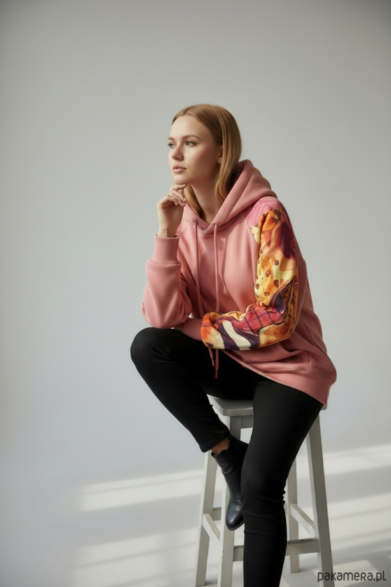 Ciepła bluza o kroju oversize w odcieniu łososiowego różu, zaprojektowana i uszyta przeze mnie jako jeden, niepowtarzalny egzemplarz. Model Buddhi łączy klasyczną, komfortową formę bluzy z artystycznymi detalami i kontrastującymi elementami we wzór abstrakcyjny.