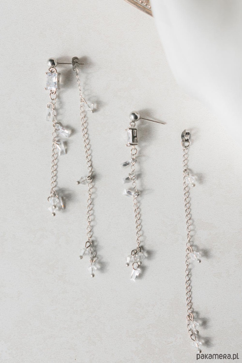 Zdecydowanie na uwagę zasługuje tutaj fakt niezwykłej i rzadko spotykanej formy kolczyka składającej się z dwóch różnych części: przedniego sztyftu z łańcuszkami oraz zapięcia, który również ma formę dłuższego łańcuszka z cyrkoniami, dzięki czemu podkreślony zostaje efekt wielowymiarowości i blasku.