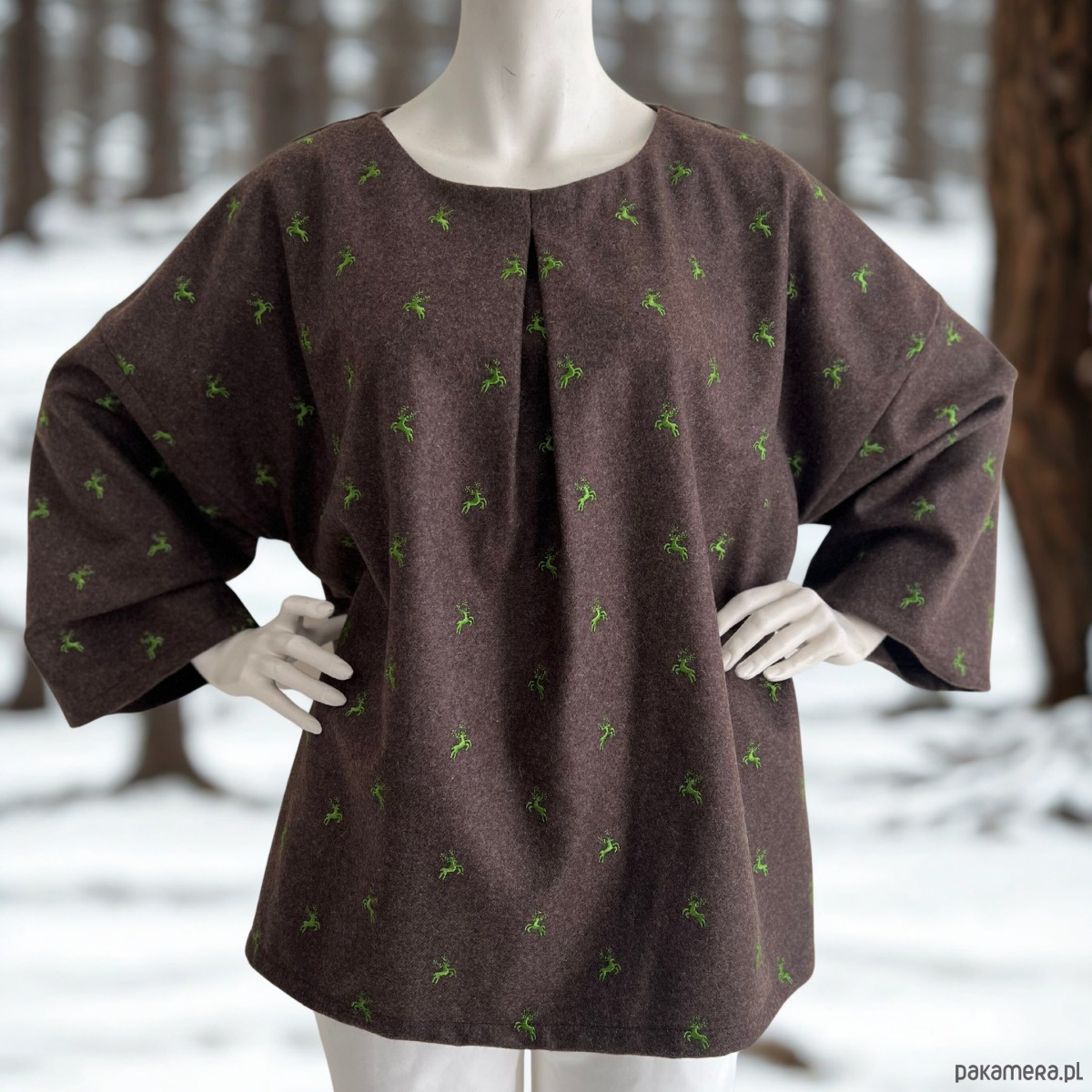 Charakteryzuje się szerokimi rękawami o długości 7/8, które nadają sylwetce lekkości i nowoczesnego wyrazu.