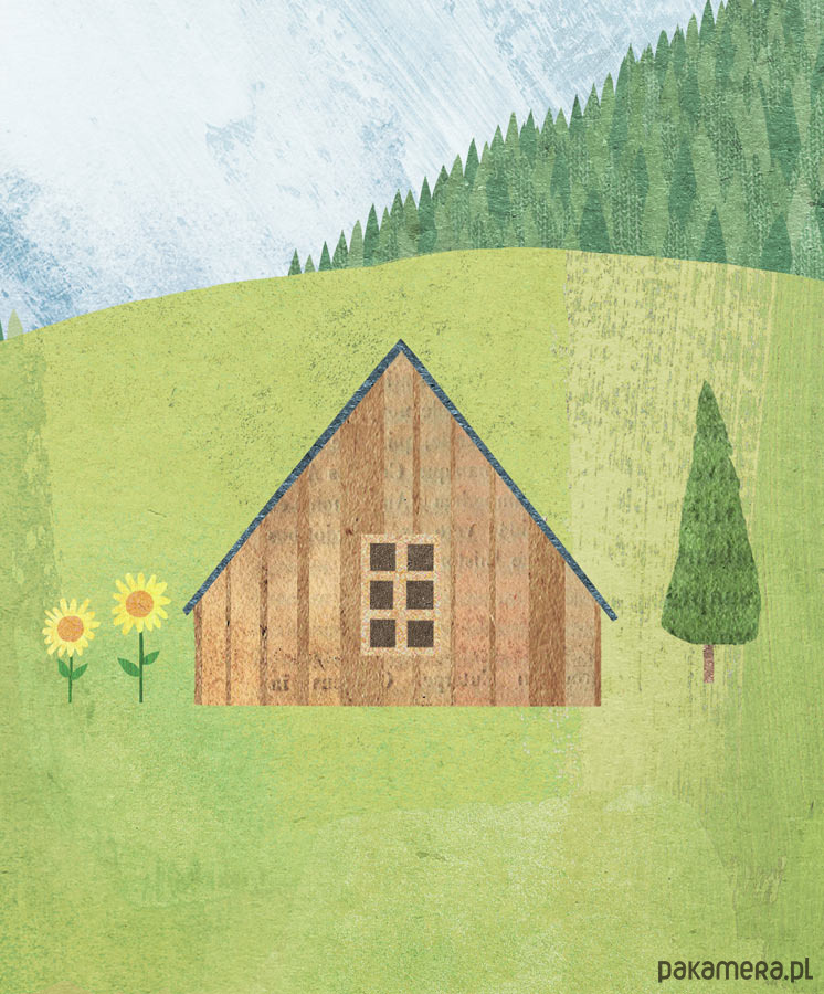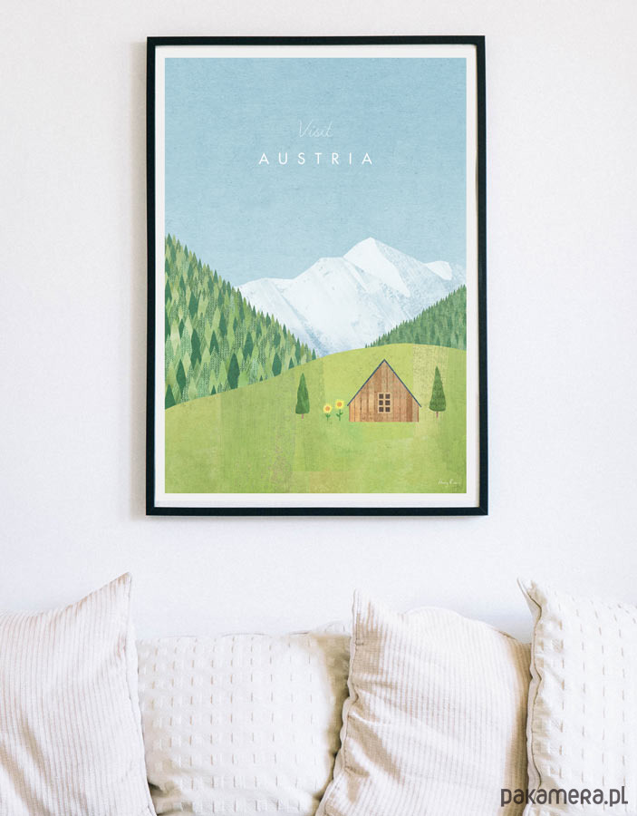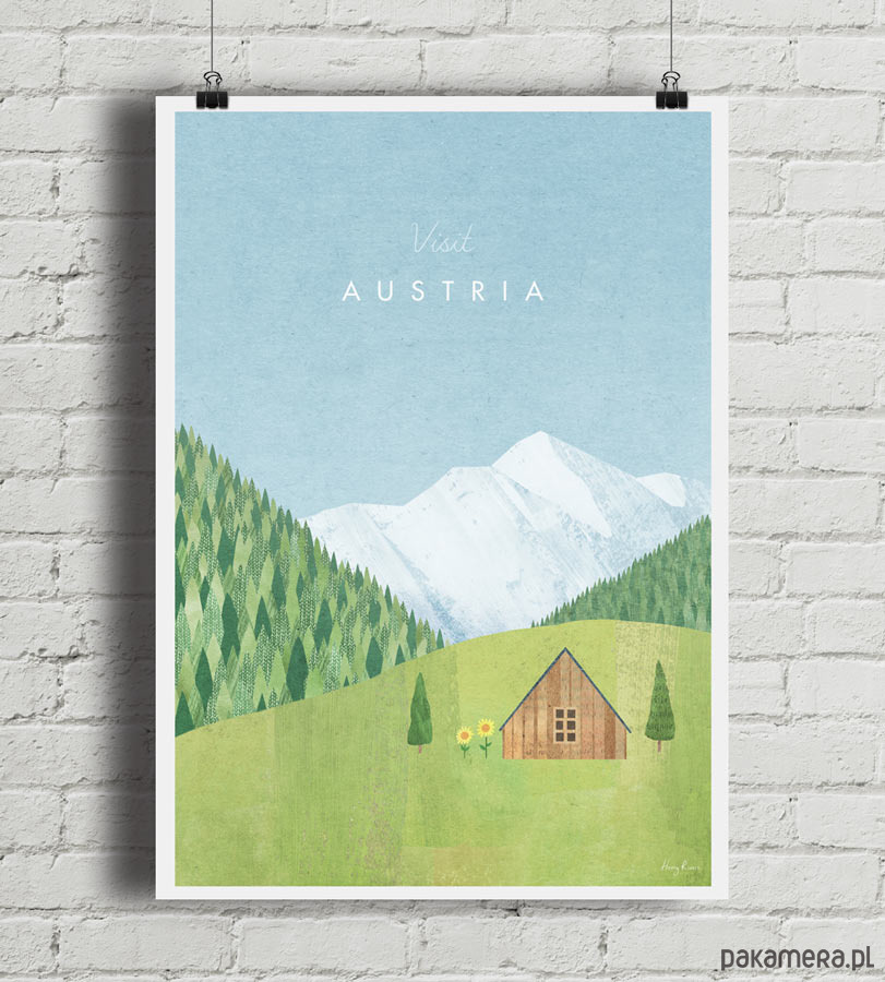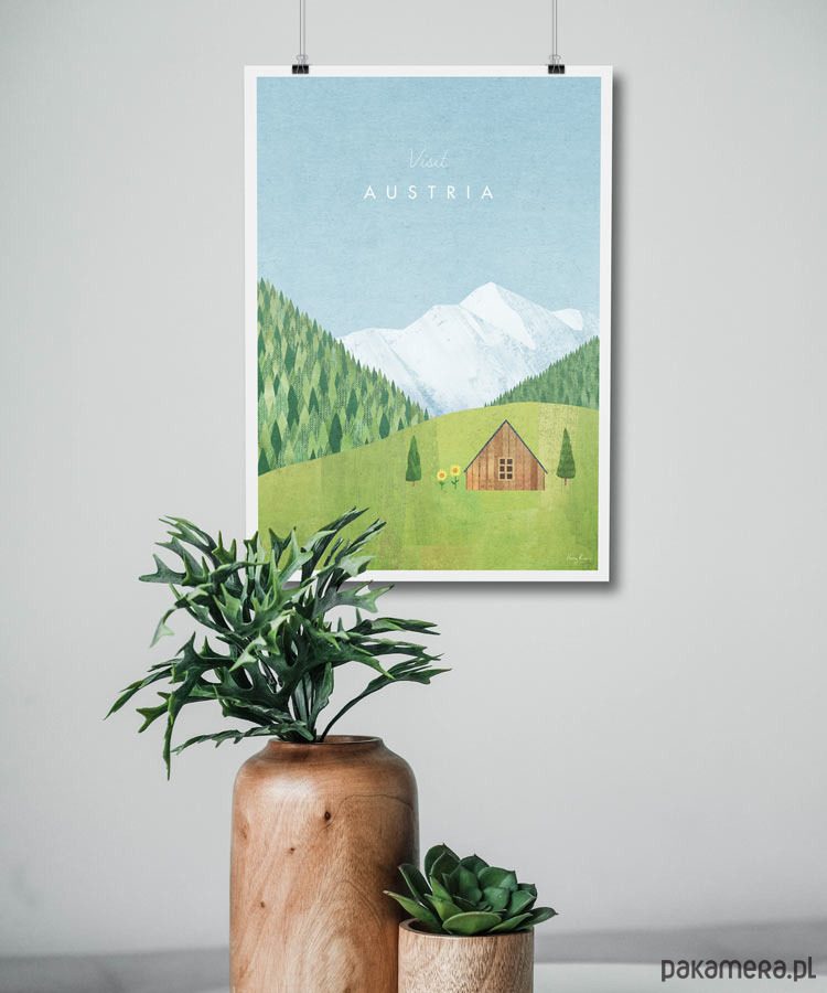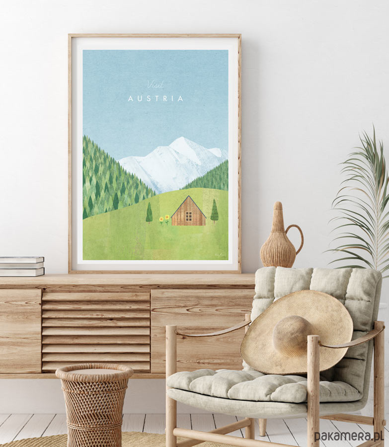Plakat w stylu vintage przedstawiający austriacki region Alp tyrolskich z drewnianą chatą na zielonej polanie otoczoną słonecznikami i gęstym lasem. W oddali widać ośnieżone szczyty gór. Grafika inspirowana plakatami podróżniczymi z lat 20-tych XX wieku.